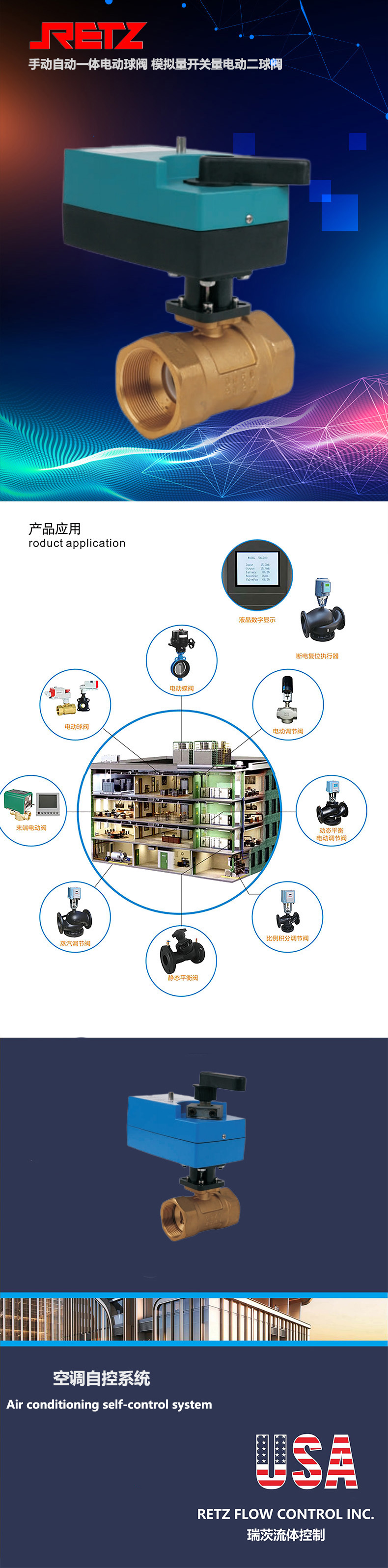 retz手动自动一体电动球阀由电动执行器与口径dn15-dn65电动球阀体组合而成,其广泛应用于空调、制冷、采暖以及其他楼宇自动控制系统中可调节系统中的介质流量,从而达到控制温度、压力和节能的目的。