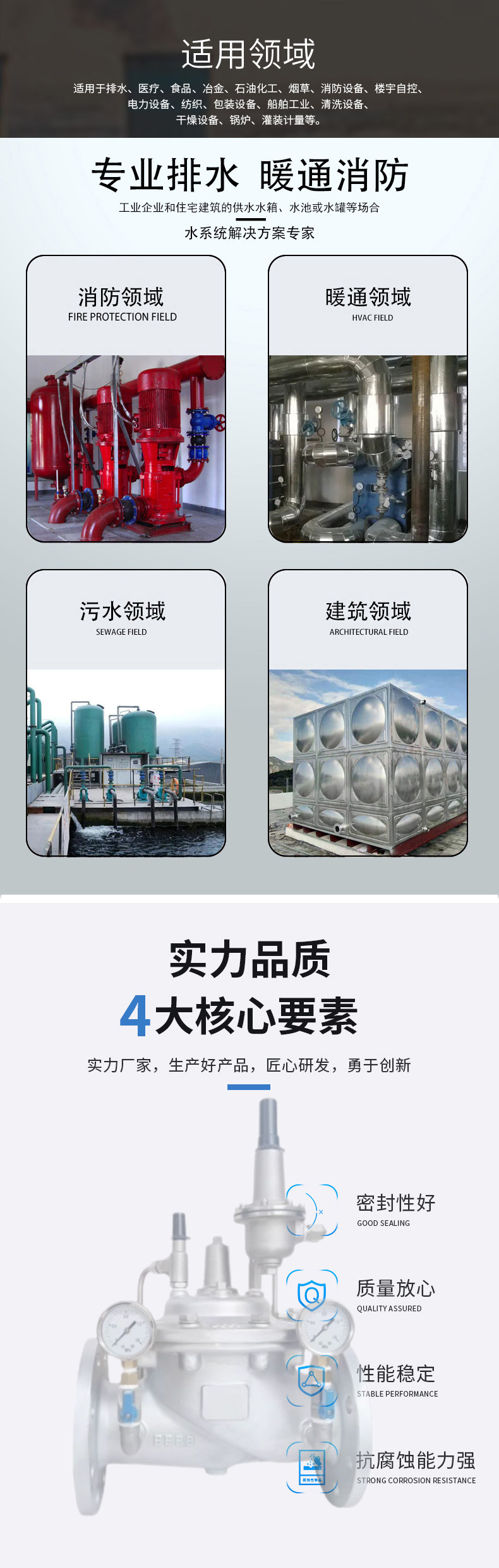 功能:当阀前压力有波动或流量变化的情况下,它能使管道内的高压水自动地减为稳定的低压水,而且减压阀的出口压力在一定范围内可随意调节。