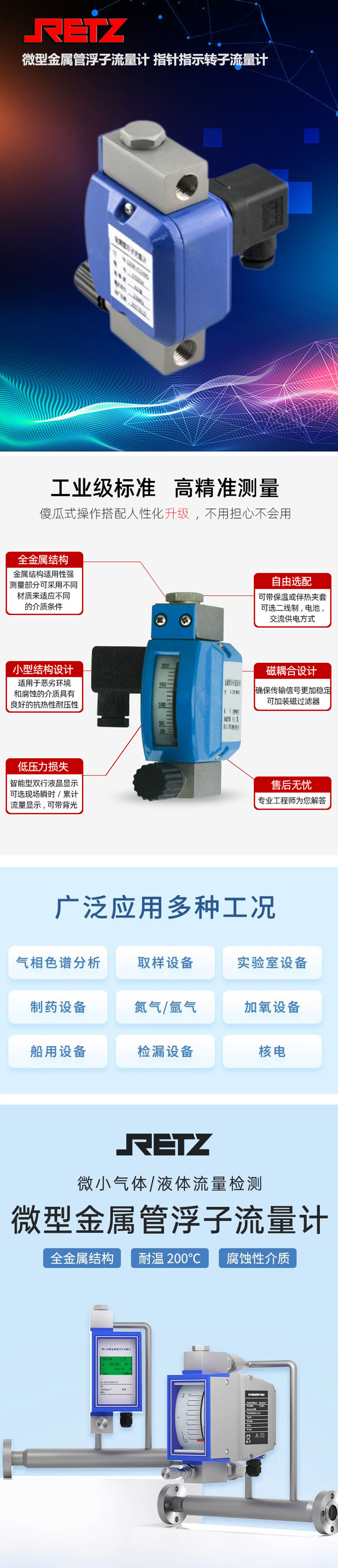 RETZ微小流量金属管浮子式流量测量仪表,可测量液体、气体或蒸汽,该仪表采用变面积式测量原理,测量部件由一个锥形测量管和浮子组成,具有坚固、稳定和应用范围广的特点。连接方式有水平连接或垂直连接,亦可选配入口压力变化或出口压力变化的压力调节器(恒流阀),广泛应用于石油、化工、化纤、钢铁、食品、轻工、制药等行业的微小流量测量和过程控制