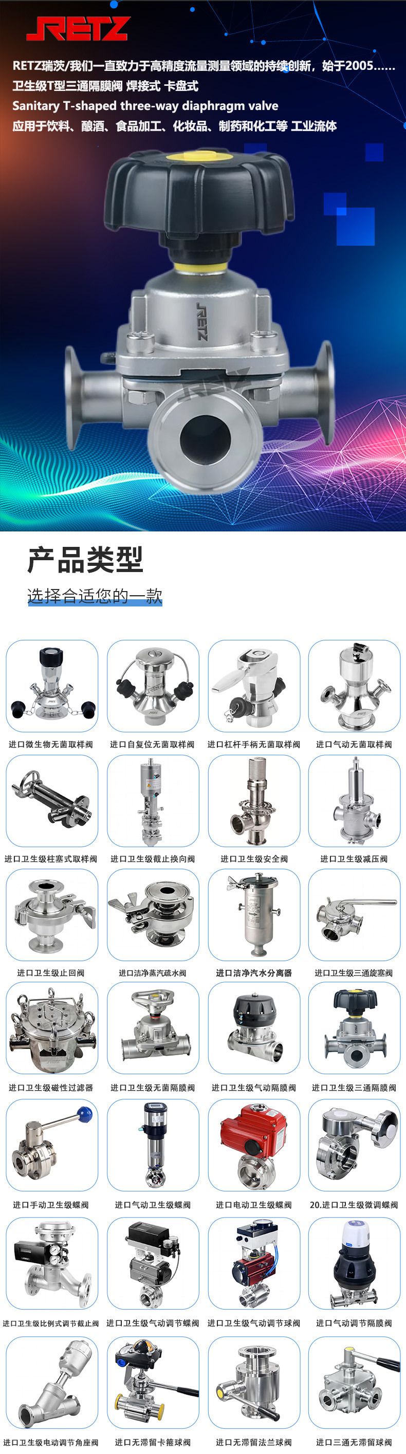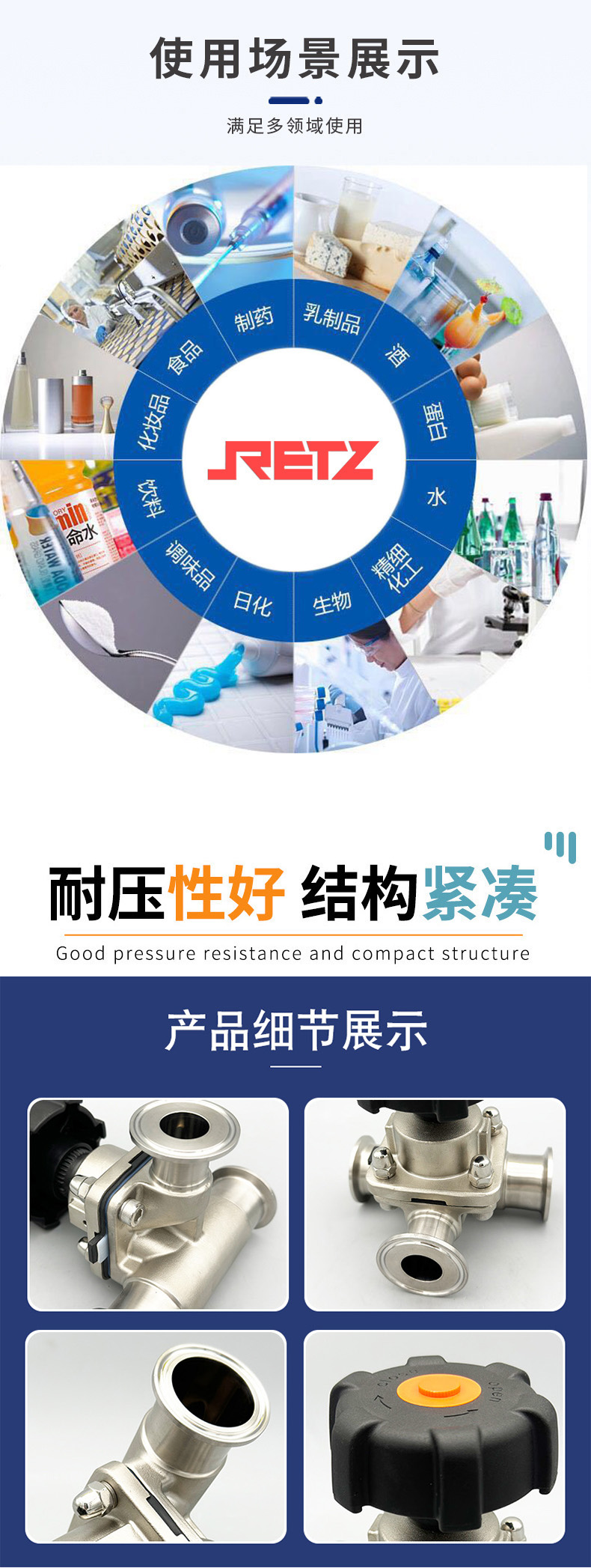 retz The imported sanitary three-way diaphragm valve can be manually or pneumatically operated to meet all requirements in the fields of sterile and ultra hygienic processing. Widely used in the pharmaceutical and biopharmaceutical industries, as well as the semiconductor ultrapure industry, microelectronics industry, and fine chemical industry