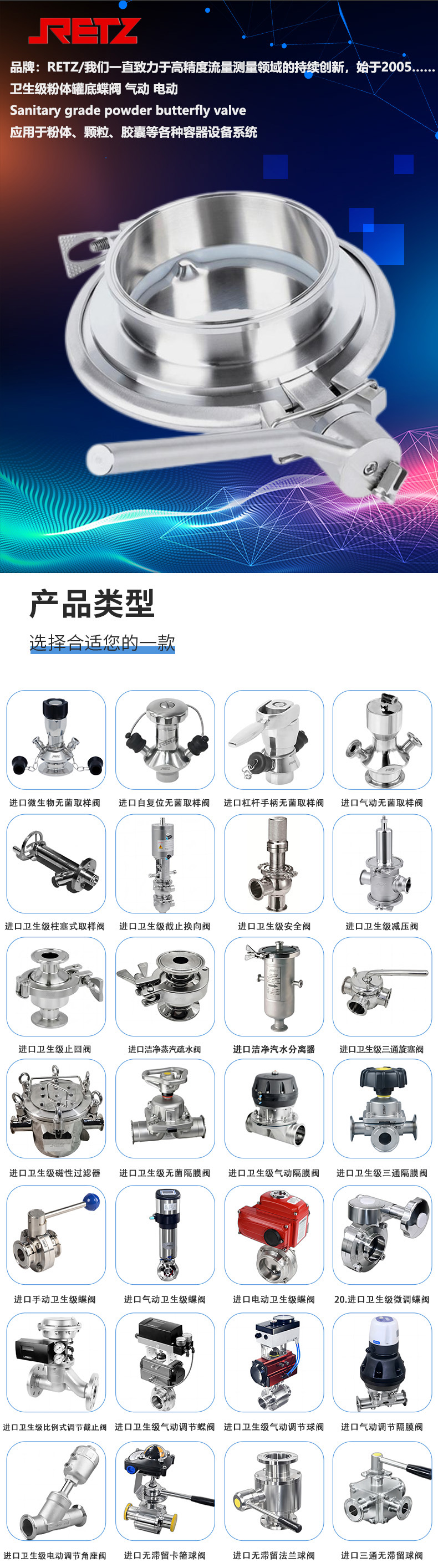 产品涵盖了:进口气动卫生级蝶阀、电动卫生级蝶阀、智能调节气动卫生级蝶阀、智能调节电动卫生级蝶阀、卫生级卡箍蝶阀、卫生级对夹蝶阀、卫生级螺纹蝶阀、卫生级焊接蝶阀、卫生级手动微调蝶阀