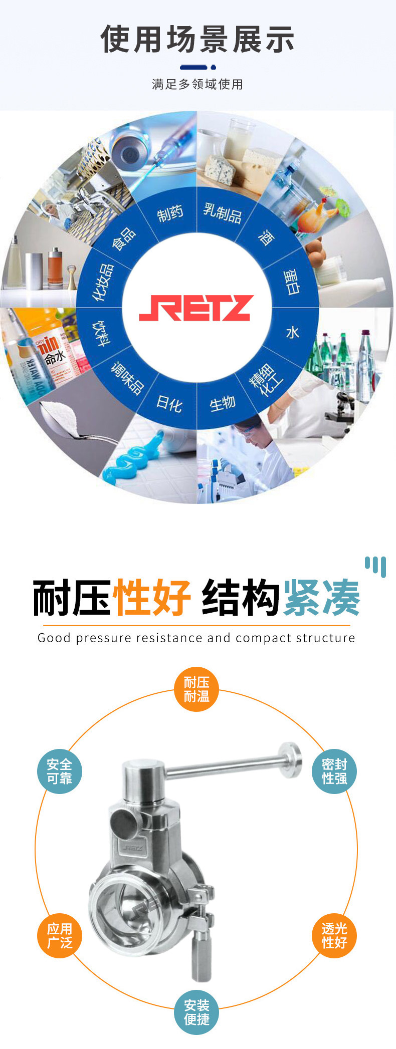 RETZ的卫生级蝶阀可以满足卫生洁净、制药、化妆品、酿酒、食品饮料工控系统的截断、调节等流体的控制