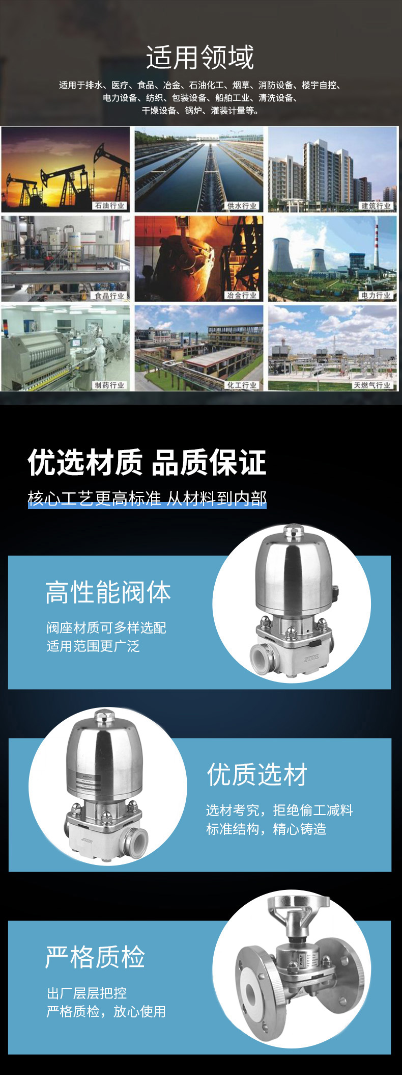 有各种标准的隔膜阀系列可向客户提供,即用于DIN标准系列,3A标准系列,SMS标准系列,ISO/IDF标准系列,BS/RJT标准系列,ASME/BPE等标准系列。