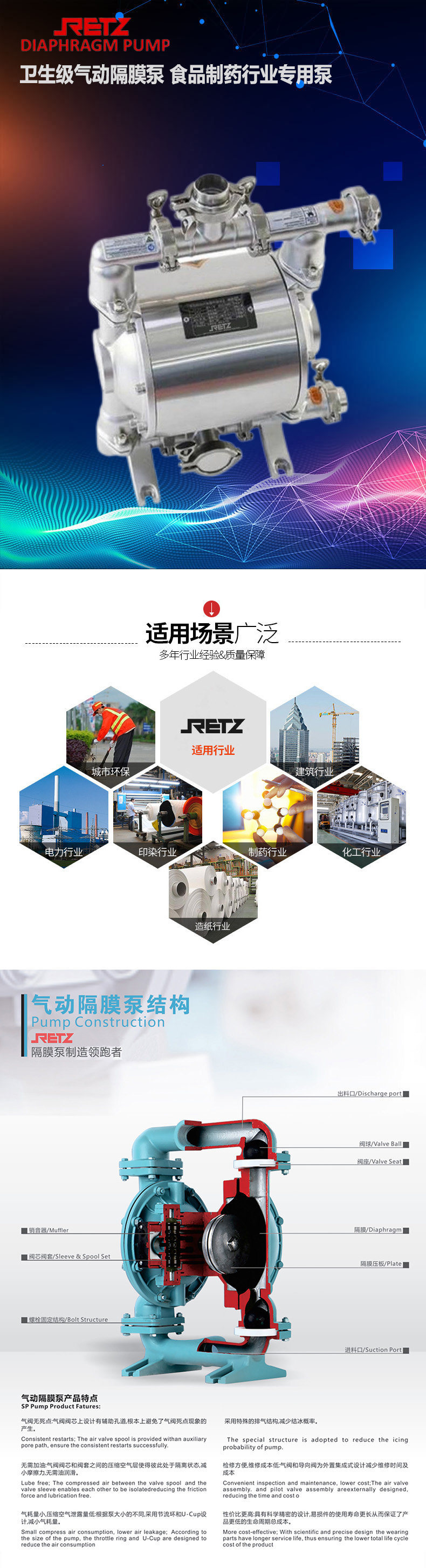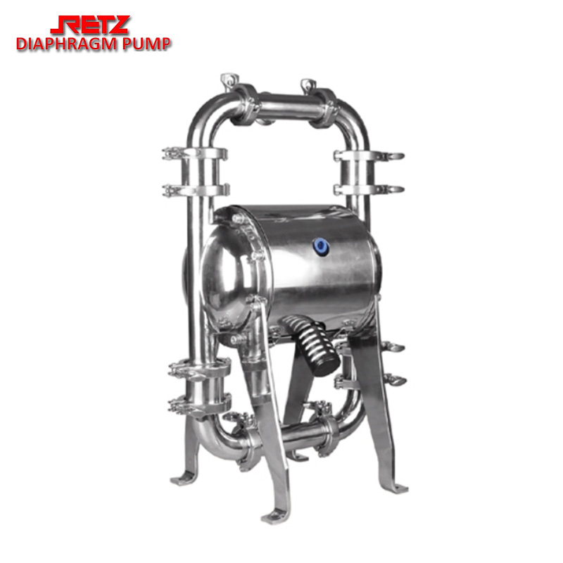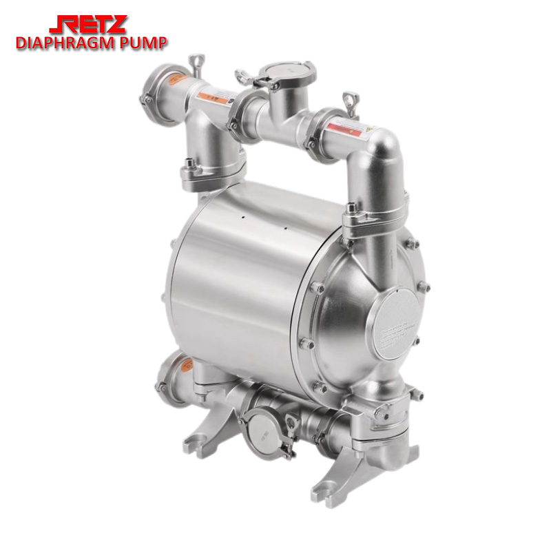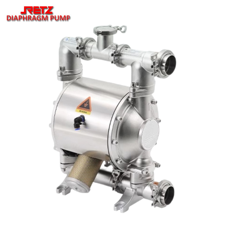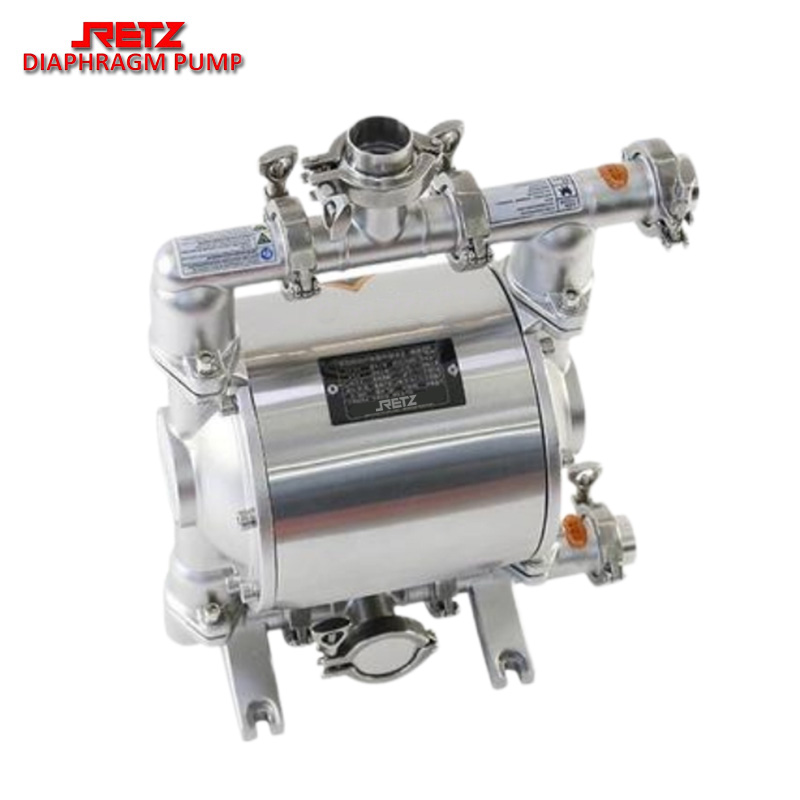 retz卫生级气动隔膜泵与其他隔膜泵最明显的不同在于配气阀结构。气阀结构取消了传统的“o”形环和柱形阀结构的配气阀。采用三相先导式,消除了阀死点和泵停机现象。提供了正确可靠的换向信号来避免停机和更快换向使泵具有更大的流量,提供了输送性能使脉冲更小,流动更稳。设计简单、安全可靠,卫生级气动隔膜泵采用快接接口,无螺纹连接,更好地满足于食品行业需要,气路部分铝合金配件的表面均有食品级环氧树脂喷涂,适用于卫生领域,所有空气阀部件可在不拆开流动部分的情况下进行更换。