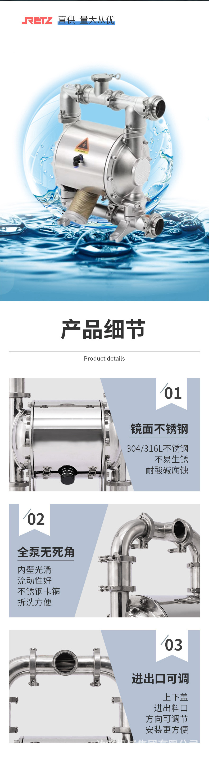 ·卫生级气动隔膜泵过流部件采用不锈钢304、316l达到食品级要求。