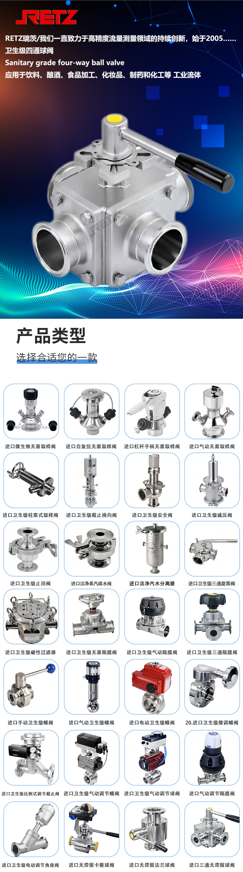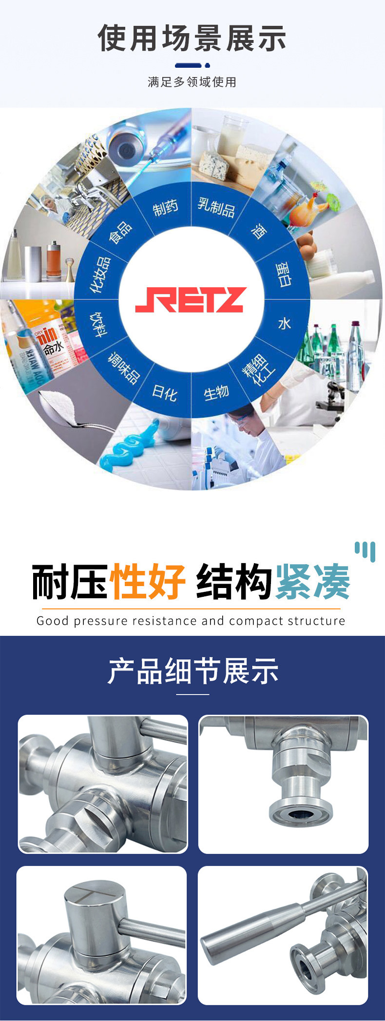 RETZ的卫生级球阀可以满足卫生洁净、制药、化妆品、酿酒、食品饮料、乳制品、化工等领域工控系统的截断、调节。产品涵盖了:进口气动卫生级球阀、电动卫生级球阀、智能调节气动卫生级球阀、智能调节电动卫生级球阀、卫生级蝶式球阀、卫生级V型球阀、卫生级无滞留球阀、卫生级三通无滞留球阀、卫生级四通无滞留球阀、卫生级法兰球阀、卫生级卡箍接球阀、卫生级内螺纹球阀、卫生级外螺纹球阀、卫生级对焊球阀、卫生级无菌法兰球阀