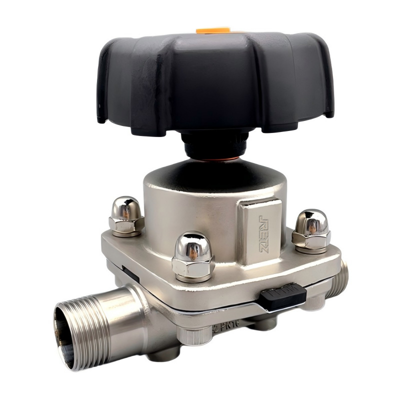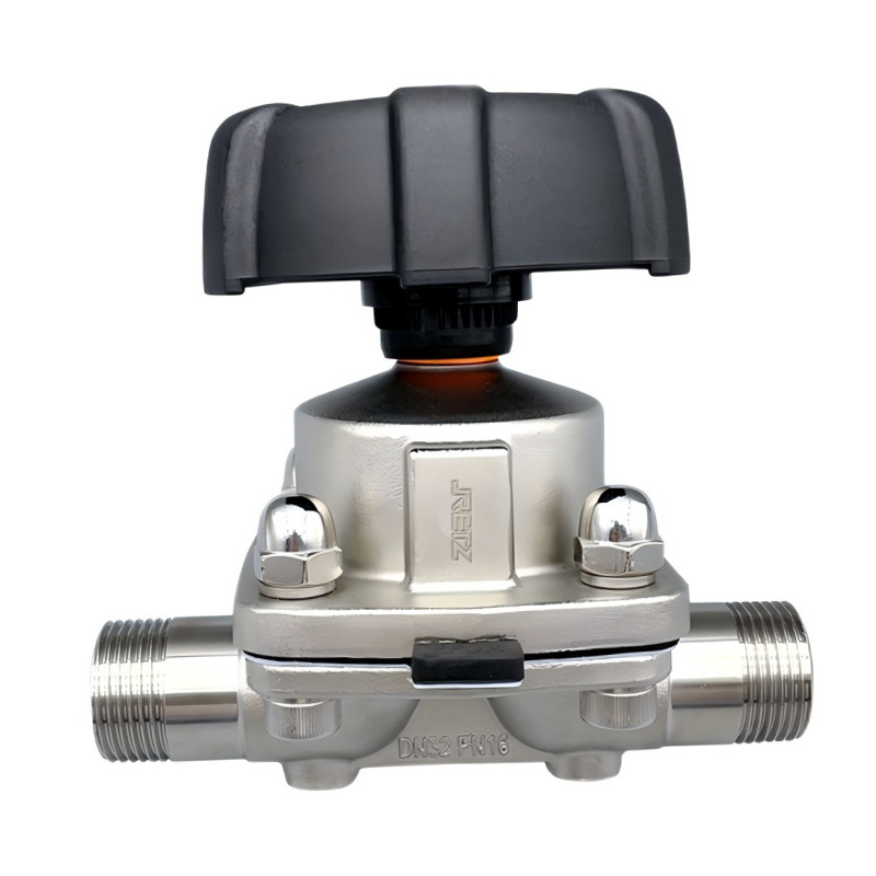 外螺纹隔膜阀通过手轮旋转带动阀杆上下运动,控制阀门隔膜片的开启、关闭;优良的隔膜系统无死角区域,易清洗,符合卫生要求