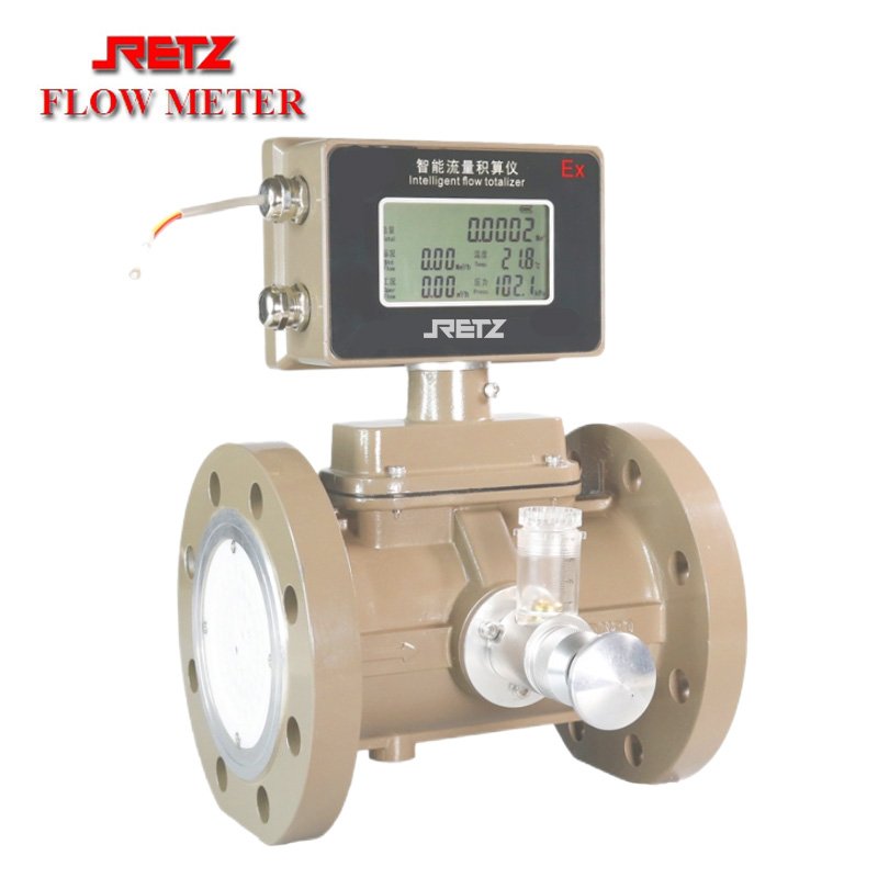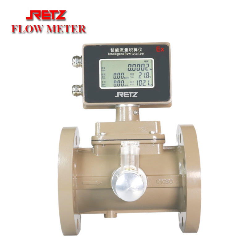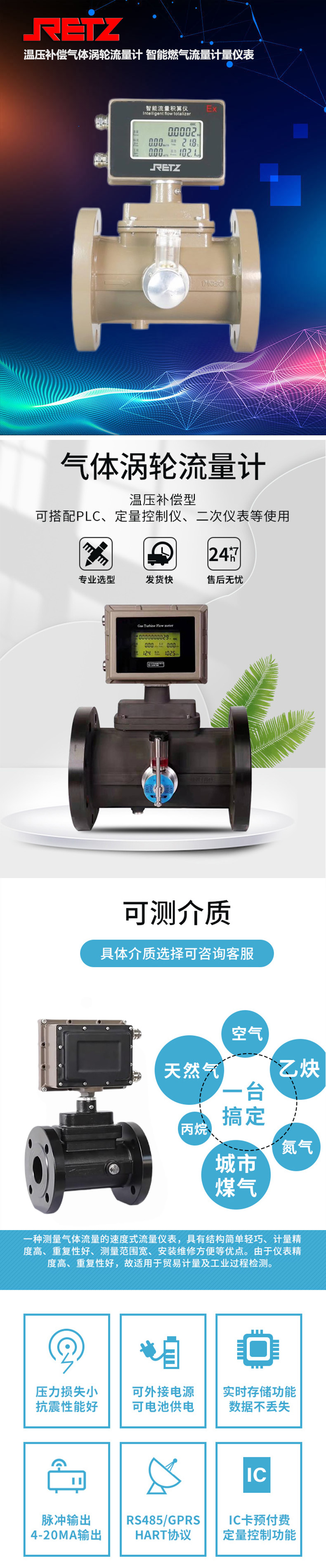 RETZ温压补偿气体涡轮流量计集温度、压力、流量传感器于一体,在线跟踪检测介质的温度和压力并进行自动补偿、压缩因子修正运算,因此具有优良的低压和高压计量性能,特别适用于各种单相气体的测量。
