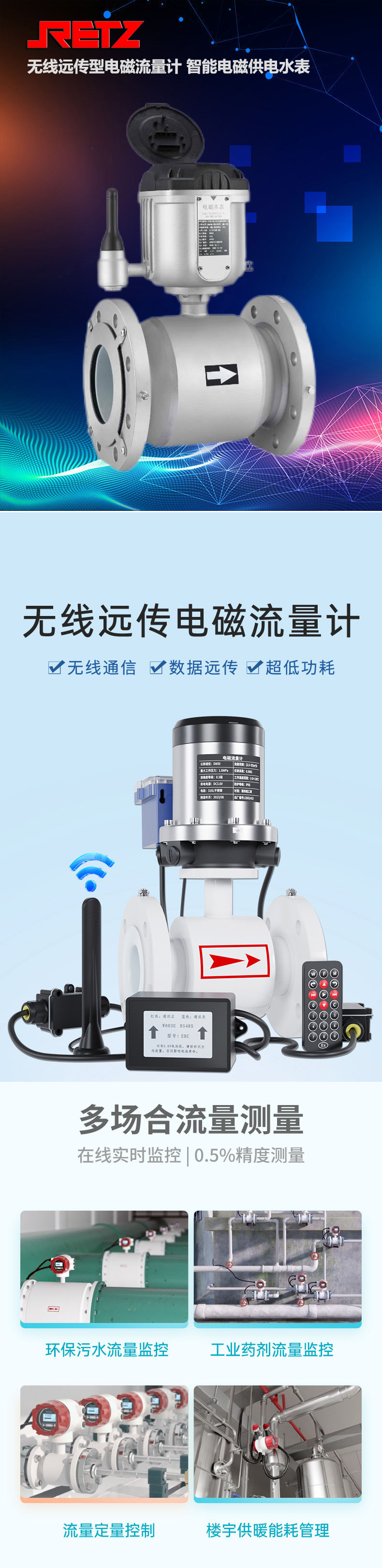 RETZ无线远传型电磁流量计专为水行业设计,满足城市供水及水资源管理系统需求,适合大客户水计量和DMA分区计量,并提供大量存储数据,确保贸易结算准确,广泛应用于现场无电源供应的场所,如城市供水、污水处理、水利工程等。