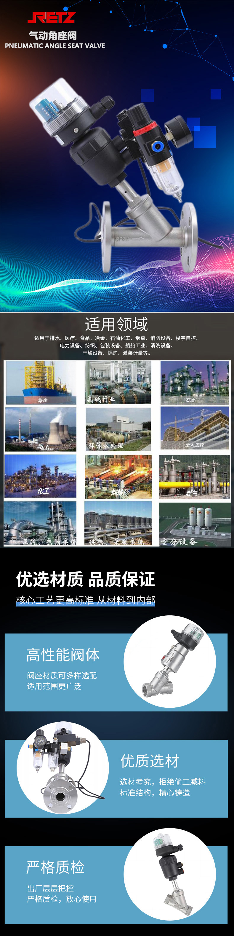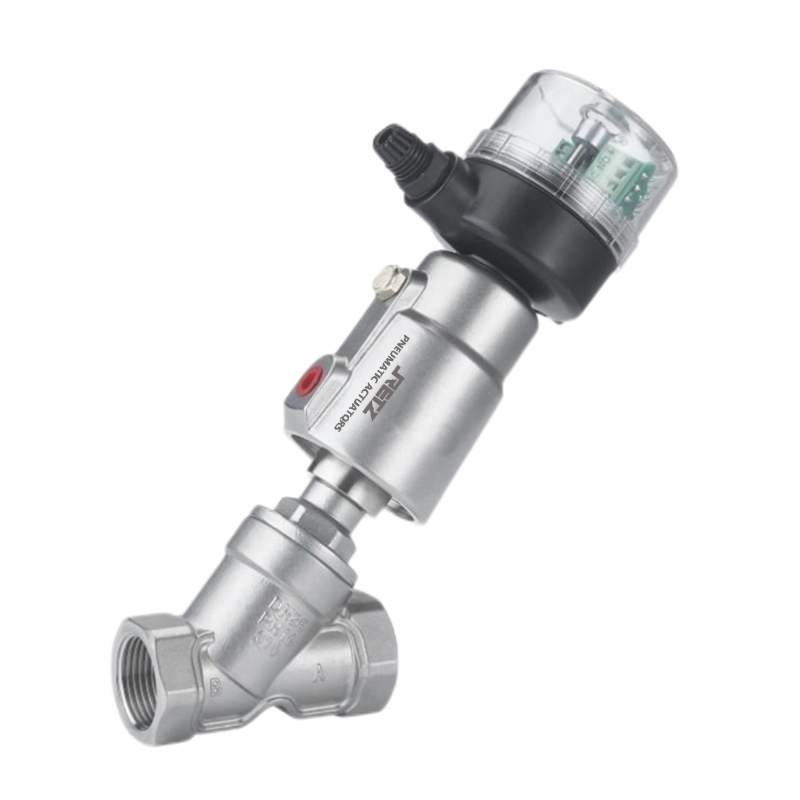 气动角座阀带信号反馈广泛应用于短时间频繁启动,具有反应灵敏,动作准确的特点,配合电磁阀使用,用气动控制可准确控制气体、液体流量。