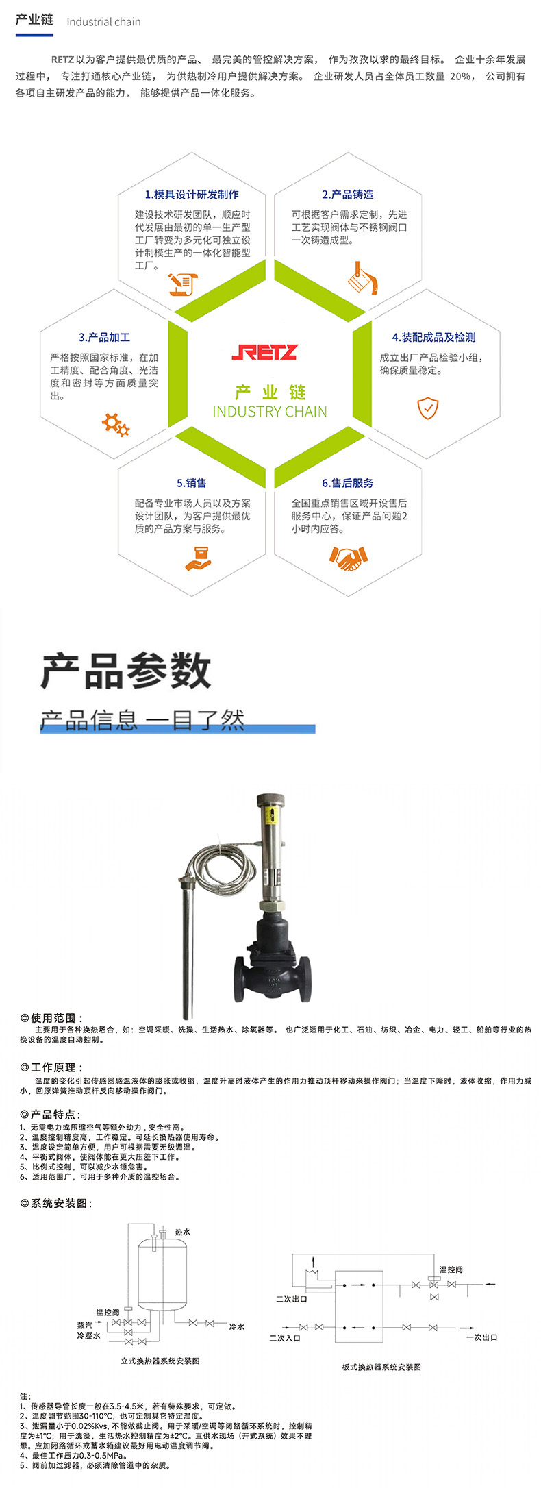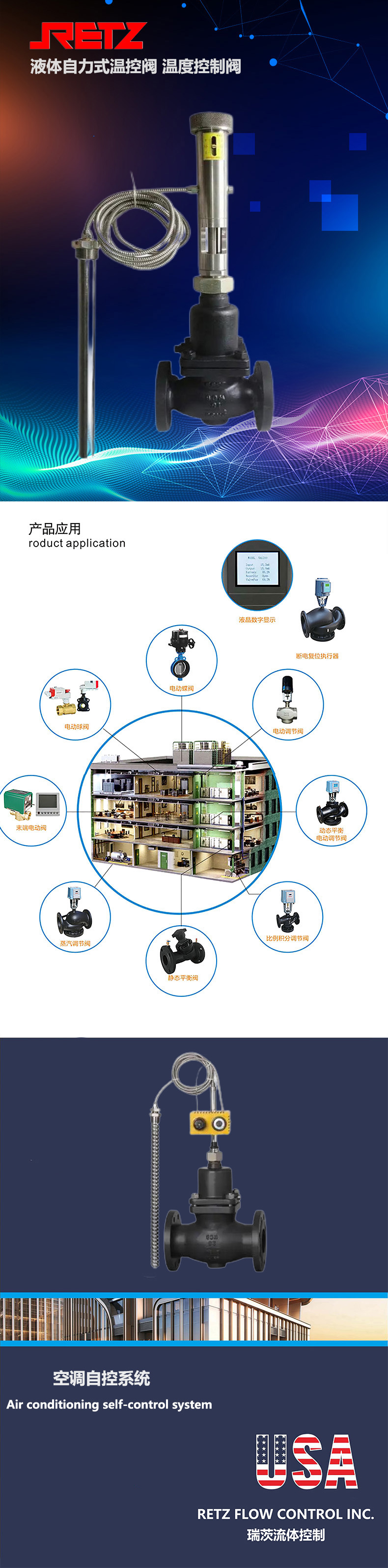 RETZ液体自力式温控阀主要用于各种换热场合,如:空调采暖、洗澡、生活热水、除氧器等。也广泛适用于化工、石油、纺织、冶金、电力、轻工、船舶等行业的热换设备的温度自动控制。