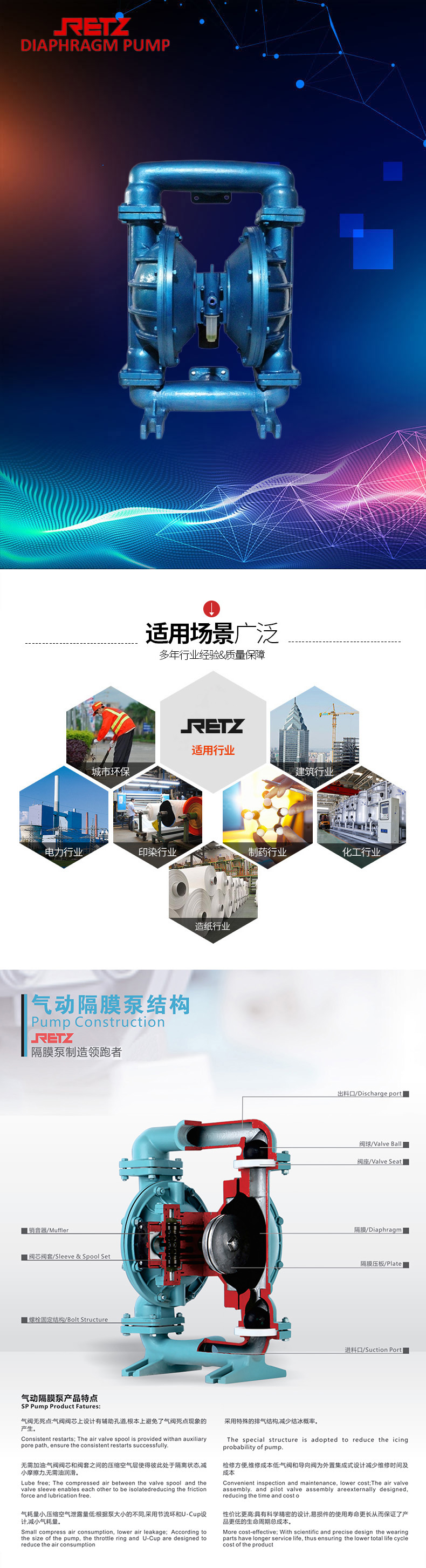 retz铸铁气动隔膜泵适用于流体腔,良好的抗磨蚀性,非常适合压滤泥浆输出