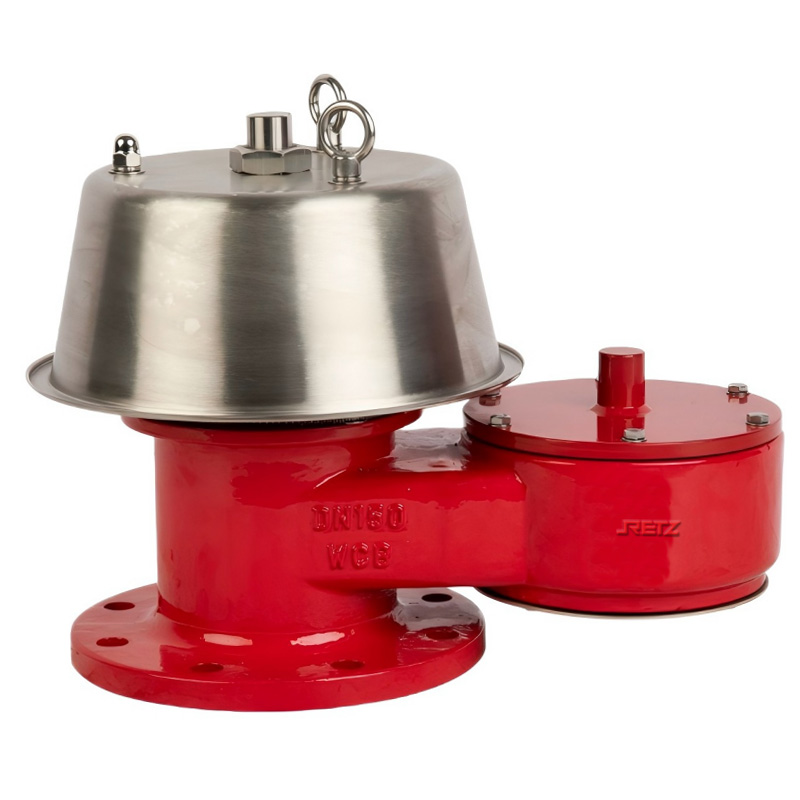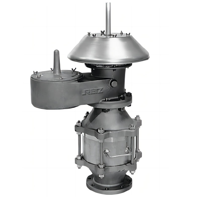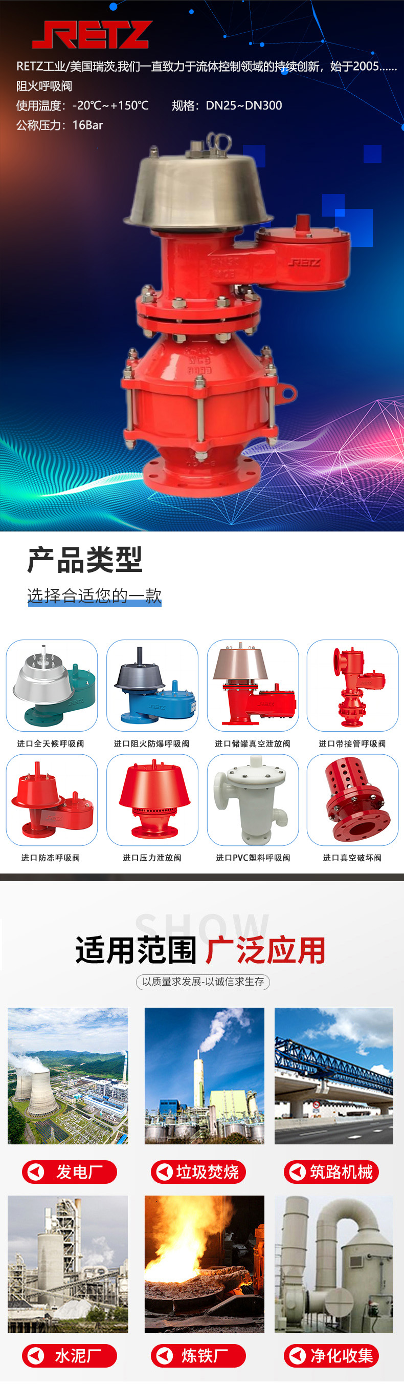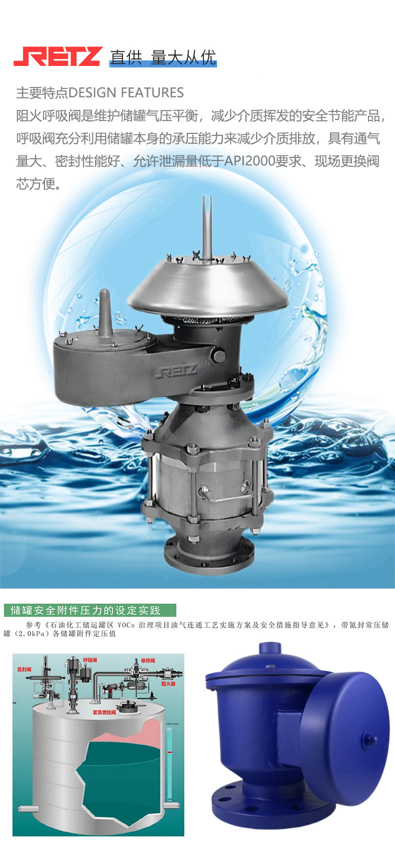 RETZ全天候阻火呼吸阀利用储罐本身的承压能力来减少介质排放,原理是利用正负压阀盘的重量来控制储罐的排气正压和吸气负压。