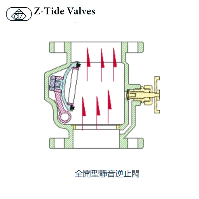 静音逆止阀俗称无声式逆止阀,主要使用于扬水管线,或具有压力的流体管路上,除了防止流体逆流外,其阀门上具有一回复弹力,当帮浦动力中断时,回复弹力能以适当速度关闭阀门,隔绝惯性流体(正压)与 动力中断后的逆流(负压)相互的撞击,及其产生的噪音,并非阀体本身具有静音或消音的功能。静音逆止阀于配管上极具重要角色,尤其安装在帮浦上方出口处的静音逆止阀,更需谨慎选择,它必需承受压力,水锤效应,及流体衝击力,若选用品质较差的静音逆止阀,当逆止阀损坏时,轻则造成流体的逆流与失压,严重时,将损坏的另件,掉落帮浦的轮叶上,将严重破坏帮浦,此时金钱上的损失更为巨大。本公司鑑于上述的缺失,另改良更实用,更经济的全开型静音逆止阀。