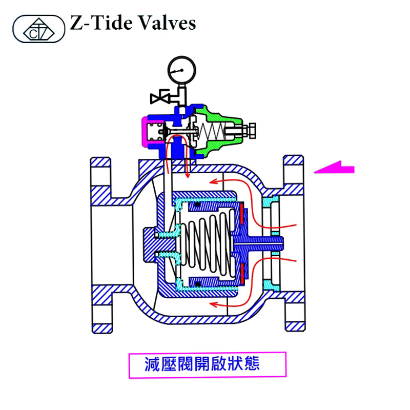 减压阀係利应用控制器(减压嚮导阀)去控制主阀,当出口端压力升高到达减压嚮导阀设定范围时,嚮导阀即自动感应出口端压力,使主阀本体背压室之压力迅速调整至阀门所需开启之 高度,即可使出口端保持所需压力。