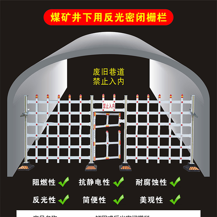 井下反光密闭栅栏产品特点:阻燃抗静电;反光特性;轻便实用,安装方便;