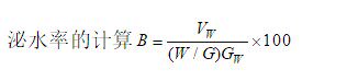 Vw__泌水总量(g)W—混凝土拌合物用水量(g)G—混凝土拌合物总量(g)Gw—所装试样的质量(g)三、 结果处理:? 试验时每批拌合物中取一个试样泌水率取三个试样的算术平均值精确到0.1%若三个试样的值和最小值与中间值之差大于中间值的15%取中间值为试验结果,若均大于15%则应重新做试验。