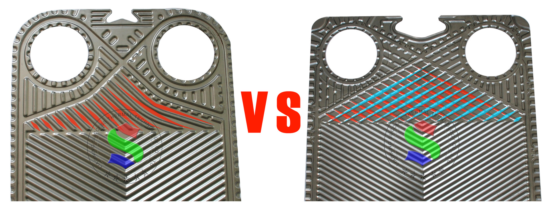 *传统的板片导流区单一,不参与换热。 *新型板片导流区交叉换热湍流布满整个板片,换热效果好.