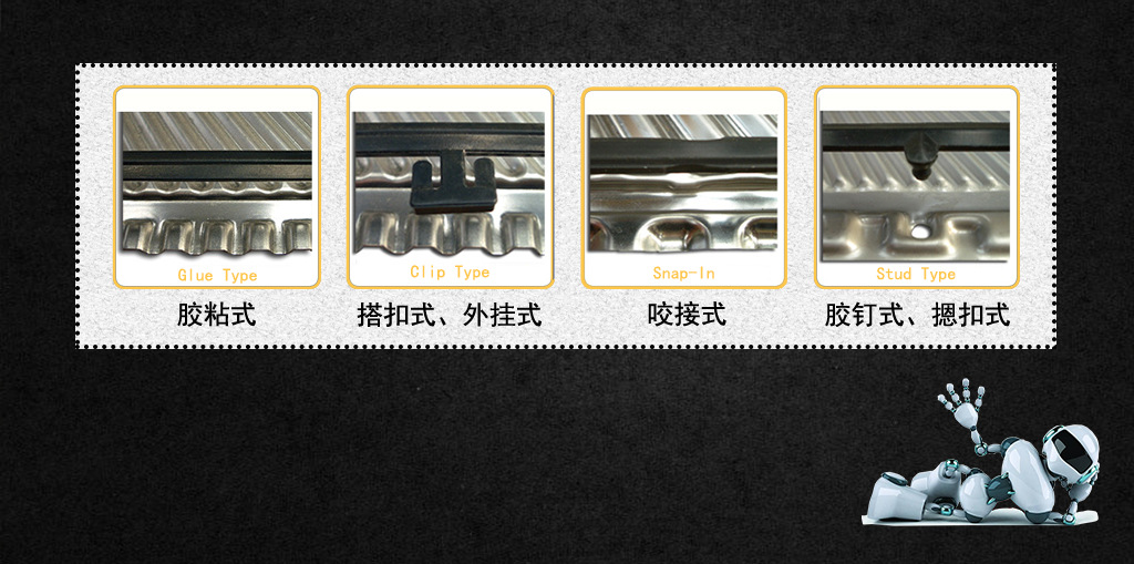 所有胶种密封垫片可设计为多种安装方式,如胶粘式、挂钩式、咬接式、按扣式等。