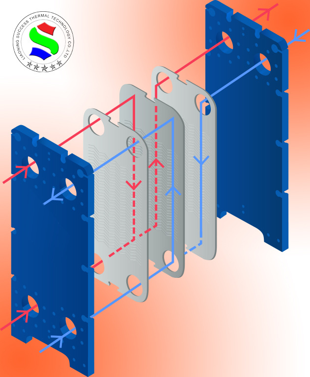 由一组波纹金属板组成,板上有四个角孔供热交换两种液体通过