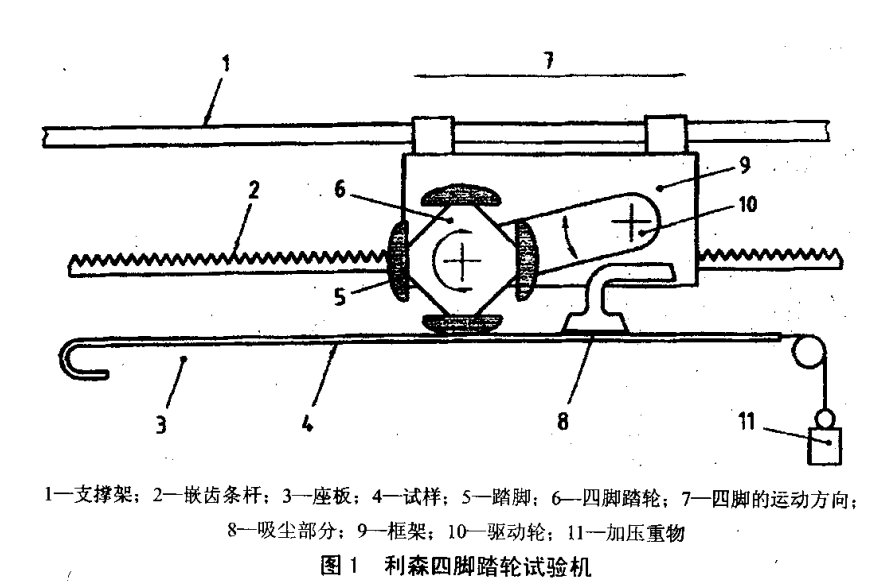 踏轮4足行走在地面覆盖纺织材料上,在压力作用下,引起绒毛磨损和压缩,观察试样失重以及外观变化来衡量纺织材料的耐磨损性能。将地毯的试样放在具有恒定负荷和滑动行程的四脚踏轮下,使其承受四脚踏轮规定次数的踩踏作用。踏轮的四只脚上装有可更换的鞋底。