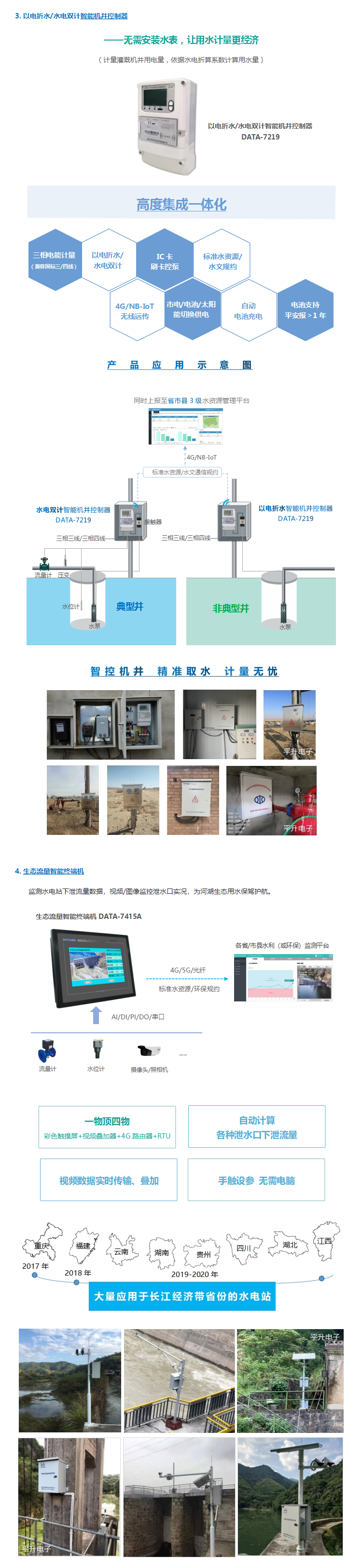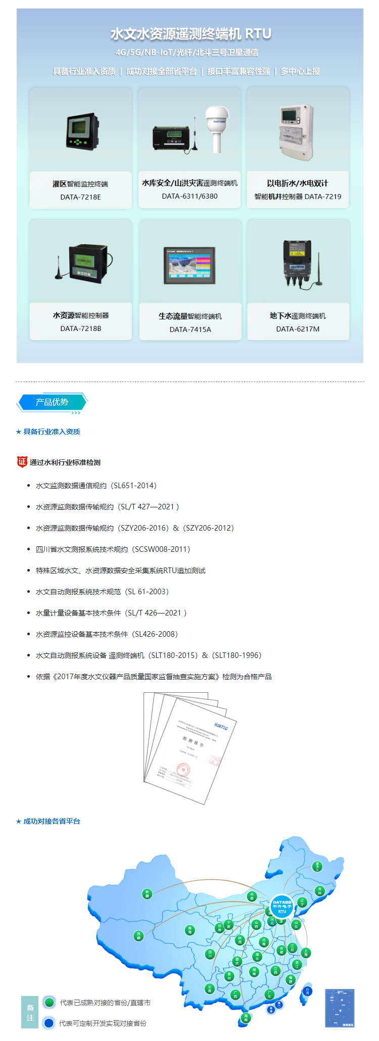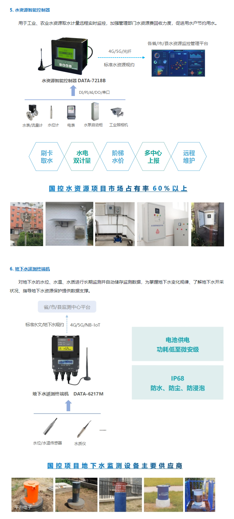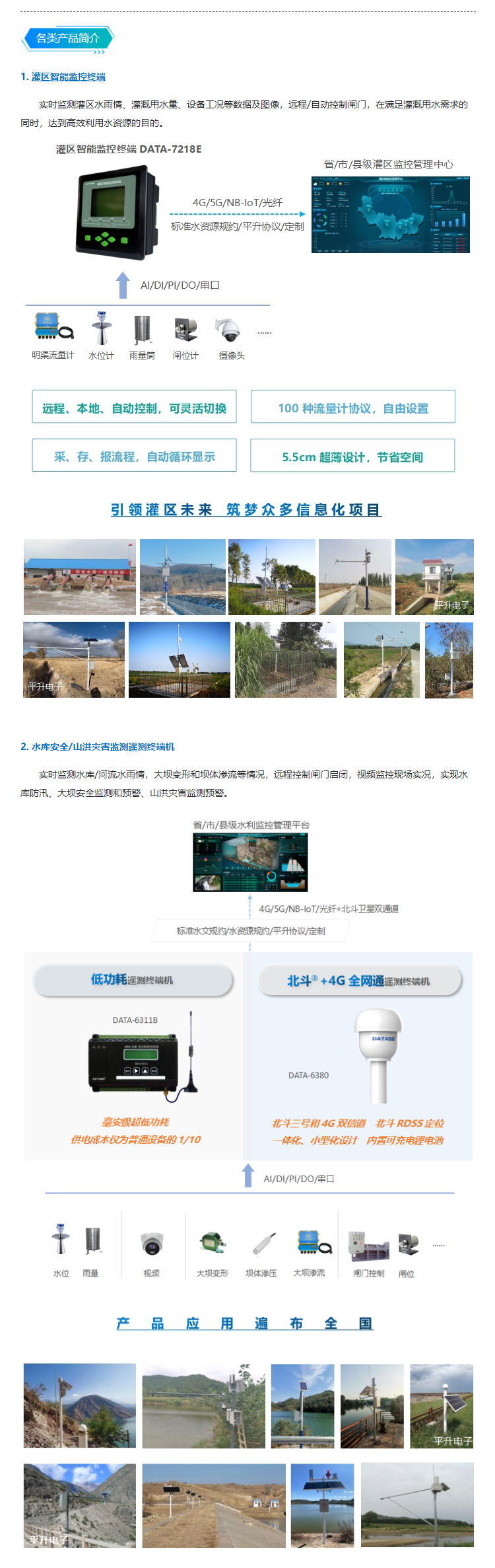 平升电子遥测终端机RTU 水文遥测终端机RTU 智能水资源遥测终端rtu 水利数传终端设备基于4G、5G、NB-IoT、光纤、北斗三号卫星等通信网络,实现数据采集、存储、处理分析、传输,远程/自动控制现场泵、闸、阀等设备运行。它广 泛应用于智慧水利领域的灌区信息化、水库安全监测、山洪灾害监测预警、机井灌溉智能控制、水资源取水计量监测、水电站生态流量监测、地下水监测等项目。
