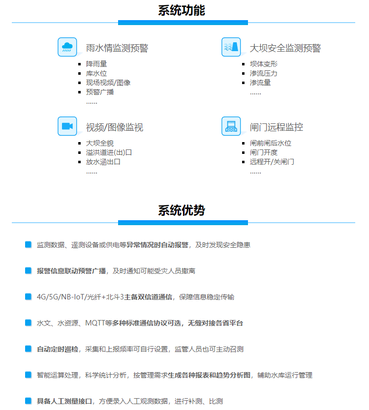 平升电子水库雨水情测报和大坝安全监测系统,实时在线监测库区降雨量和库水位,动态监测和分析大坝渗流量、渗流压力、表面变形等大坝安全要素,视频/图像监视现场实况,可扩展闸门智能控制功能。系统科学分析智能预警,为水库安全运行管理、水库安全鉴定、水库除险加固方案制定和防汛抗旱指挥调度提供数据依据,提升水库信息化、智慧化管理水平。