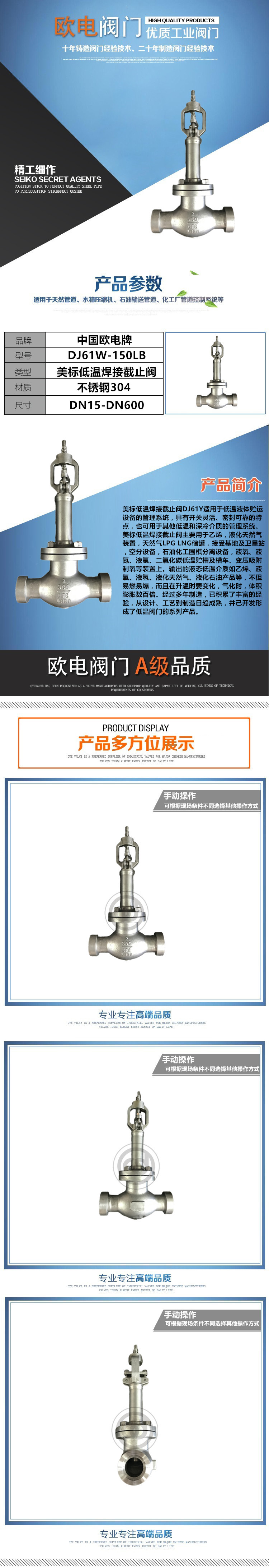 美标低温焊接截止阀DJ61Y适用于低温液体贮运设备的管理系统,具有开关灵活、密封可靠的特点,也可用于其他低温和深冷介质的管理系统。美标低温焊接截止阀主要用于乙烯,液化天然气装置,天然气LPG LNG储罐,接受基地及卫星站,空分设备,石油化工围棋分离设备,液氧、液氮、液氩、二氧化碳低温贮槽及槽车、变压吸附制氧等装置上。输出的液态低温介质如乙烯、液氧、液氢、液化天然气、液化石油产品等,不但易燃易爆,而且在升温时要变化,气化时,体积膨胀数百倍。经过多年制造,已积累了丰富的经验,从设计、工艺到制造日趋成熟,并已开发形成了低温阀门的系列产品。