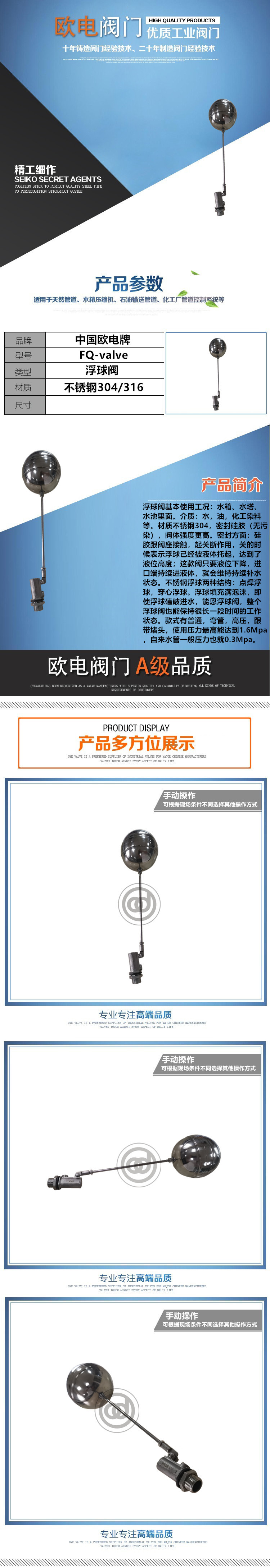 浮球阀基本使用工况:水箱、水塔、水池里面。介质:水,油,化工染料等。材质不锈钢304,密封硅胶(无污染),阀体强度更高。密封方面:硅胶跟阀座接触,起关断作用,关的时候表示浮球已经被液体托起,达到了液位高度;这款阀只要液位下降,进口端持续进液体,就会维持持续补水状态。不锈钢浮球两种结构:点焊浮球,穿心浮球。浮球填充满泡沫,即使浮球磕破进水,能恩浮球阀,整个浮球阀也能保持很长一段时间的工作状态。款式有普通,弯管,高压,跟带堵头,使用压力zui高能达到1.6Mpa,自来水管一般压力也就0.3Mpa。