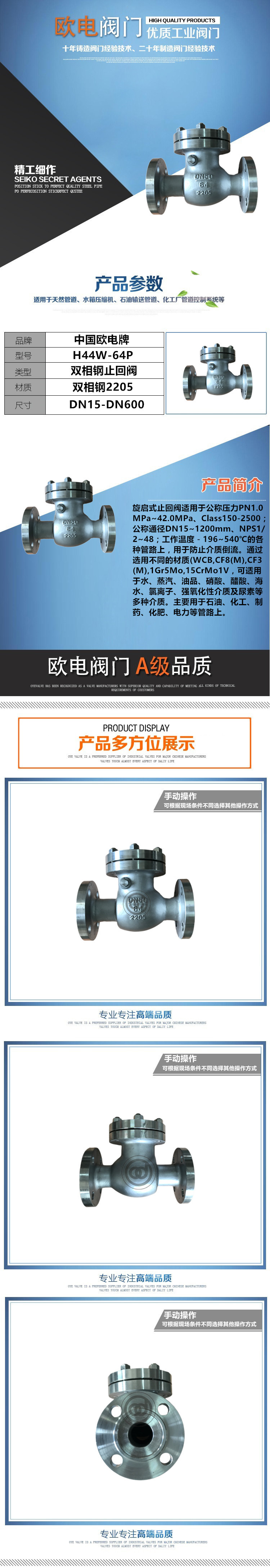 双相钢旋启式止回阀适用于公称压力PN1.0MPa~42.0MPa、Class150-2500;公称通径DN15~1200mm、NPS1/2~48;工作温度-196~540℃的各种管路上,用于防止介质倒流。通过选用不同的材质(WCB,CF8(M),CF3(M),1Gr5Mo,15CrMo1V,可适用于水、蒸汽、油品、硝酸、醋酸、强氧化性介质及尿素等多种介质。主要用于石油、化工、制药、化肥、电力等管路上。