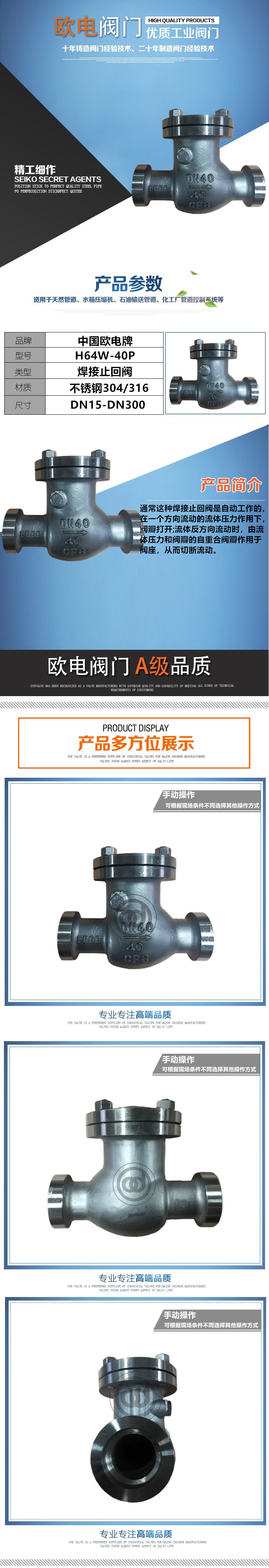 H64W焊接止回阀,驱动方式可选用无驱动,连接方式可选用法兰、焊接,结构形式可选用升降式、旋启式,密封结构可选用软密封、硬密封,压力范围PN0.1-32Mpa,公称通径为DN15-600mm,材质可选用铸铁、铸钢、不锈钢。由于阀门的使用范围非常的广泛,同一种阀门在不同的场合与工况有不同的搭配,如果您是非专业人士,欢迎您向本公司来电咨询。