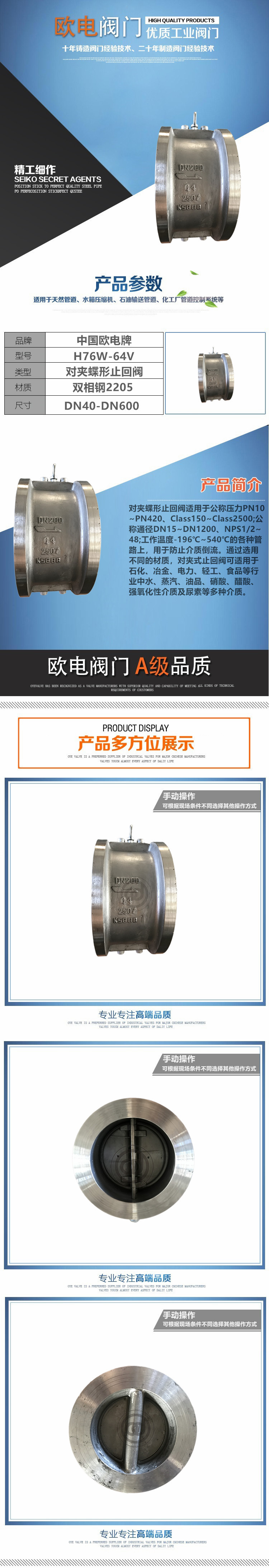 针对国内传统使用的H44型法兰连接旋启式止回阀具有体积笨大,流体阻力大,阀门关闭时水锤压力高,安装、维修难,使用寿命短等缺点。阀门供应网针对传统法兰结构止回阀存在的问题,研制生产了对夹式止回阀系列,H76对夹双瓣旋启式止回阀具有结构长度短,体积小、重量轻,阀瓣关闭快速,水锤压力小,安装方便,流体阻力小,动作灵敏、密封性能好,阀瓣行程短、关阀冲击力小,整体结构、简单紧凑,使用寿命长、可靠性高等特点。