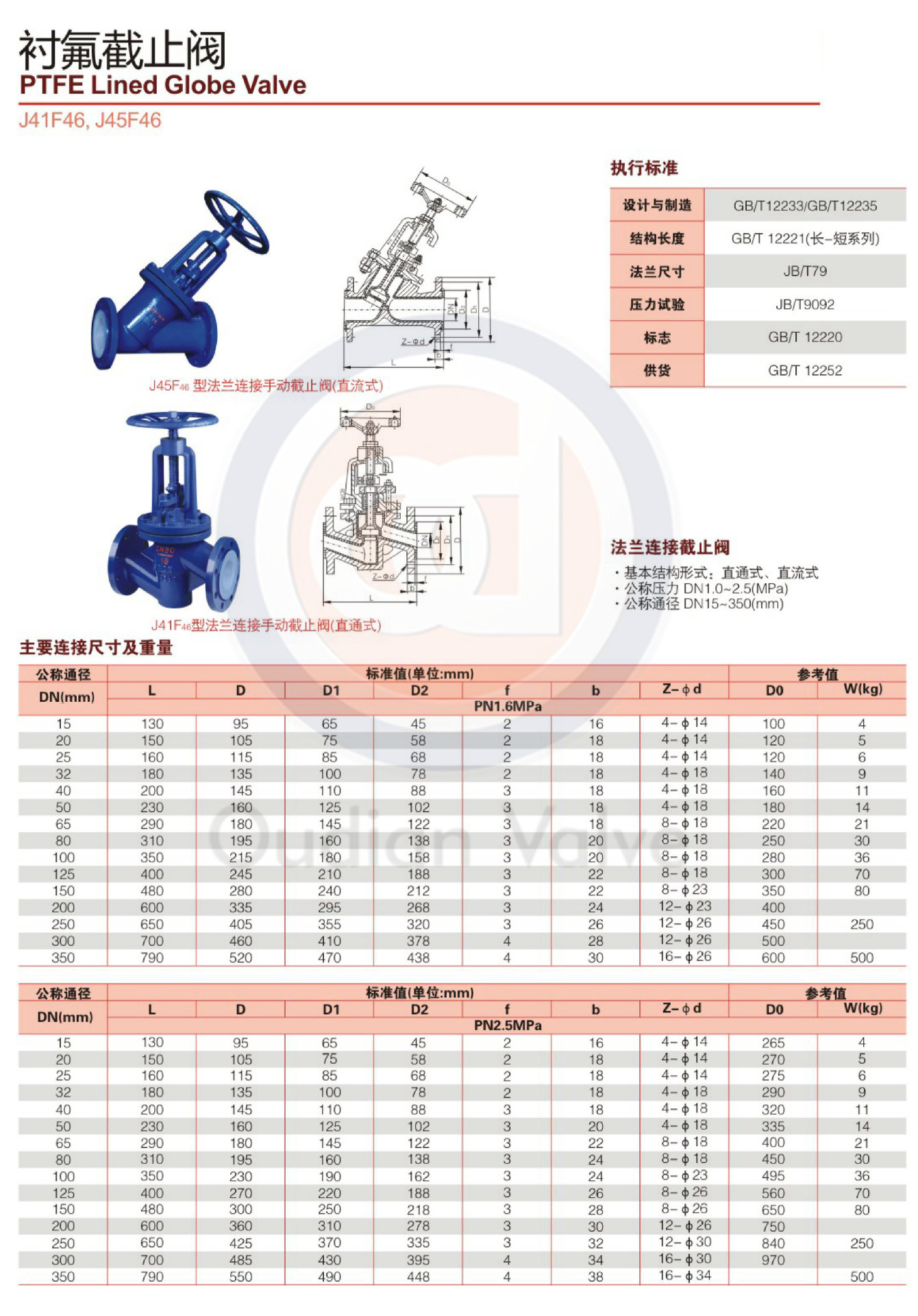 1.氟塑料全衬里J41F46型直通式、J45F46型直流式、J44F46型角式截止阀,具有结构紧凑、启闭灵活、耐腐蚀性能强,行程短(一般为公称通径1/4)等项优点,被广泛应用在石油、化工等管路系统中做截断介质用,但需要强调的是氟塑料衬里的截止阀严禁用做流量调节,以免节流口处产生的高速介质流冲蚀破坏密封面。