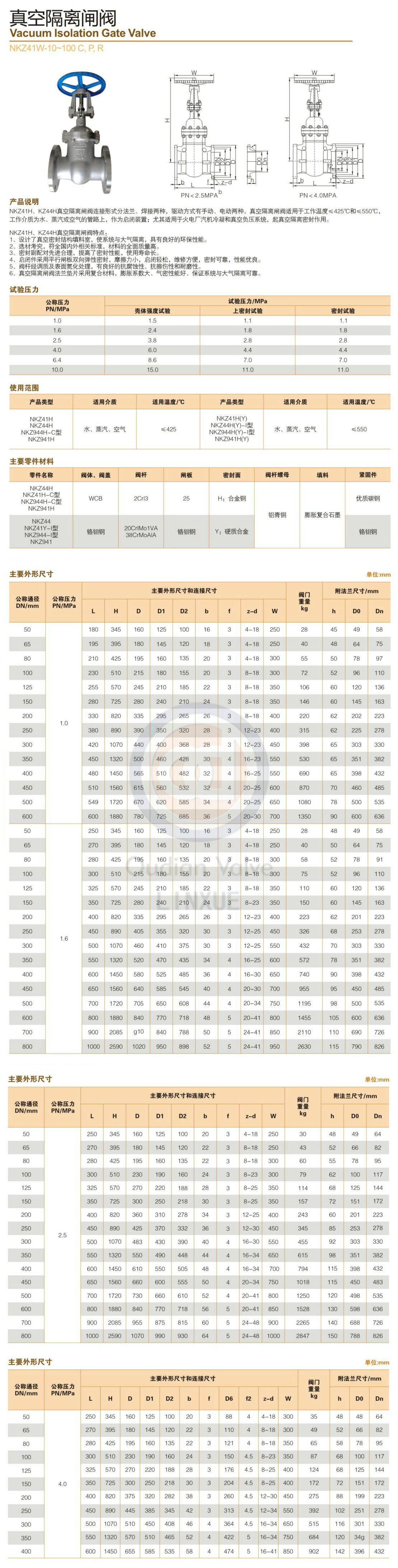 NKZ4W-64不锈钢真空闸阀适用于工作温度≤425℃(铬钼钢材NKZ44Y型为≤550℃),工作介质为水、蒸汽或空气的管路上,作为启闭装置;尤其适用于火电厂汽机冷凝和真空负压系统,起真空隔离密封作用。