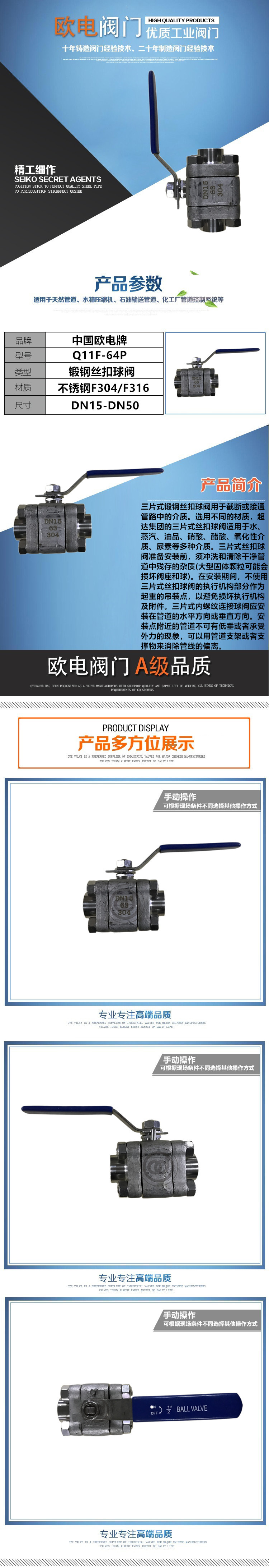 锻钢丝扣球阀用于截断或接通管路中的介质。选用不同的材质,锻钢丝扣球阀适用于水、蒸汽、油品、硝酸、醋酸、氧化性介质、尿素等多种介质。锻钢丝扣球阀准备安装前,须冲洗和清除干净管道中残存的杂质(大型固体颗粒可能会损坏阀座和球)。在安装期间,不使用锻钢丝扣球阀的执行机构部分作为起重的吊装点,以避免损坏执行机构及附件。锻钢内螺纹连接球阀应安装在管道的水平方向或垂直方向。安装点附近的管道不可有低垂或者承受外力的现象,可以用管道支架或者支撑物来消除管线的偏离。