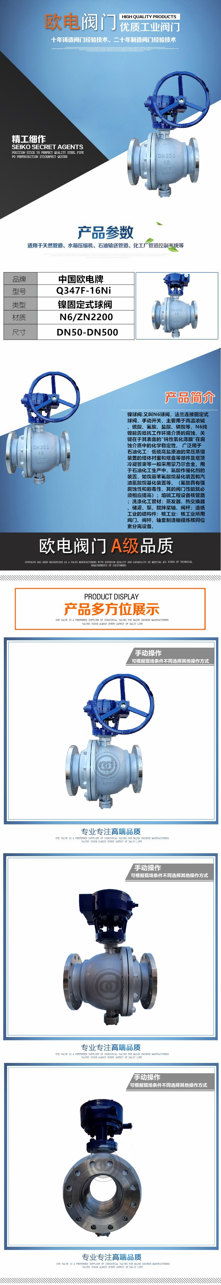 镍球阀:又叫N6球阀,法兰连接固定式球阀,密封面为PTFE四氟密封,PN16~25压力,手动开关,主要用于高温浓碱、、氟酸、、磷酸等,N6纯镍能否抵抗工作环境介质的腐蚀,关键在于其表面的"钝性氧化薄膜"在腐蚀介质中的化学稳定性。 镍球阀广泛用于 石油化工:低硫高盐原油的常压蒸馏装置的塔体衬里和塔盘等部件及塔顶冷凝管束等一般采用蒙乃尔合金。用于石油化工生产中,氟酸作催化剂的装置,如烷基苯氟酸烷基化装置和汽油氢酸烷基化装置等。(氟酸具有强腐蚀性和剧毒性,其的阀门性能就必须相应提高);熔碱工程设备核管路;洗涤化工管材;蒸发器、热交换器、储灌、泵、搅拌桨轴、阀杆;造纸工业的结构件:核工业:核工业所用阀门、阀杆、轴套制造铀提炼核同位素分离设备。