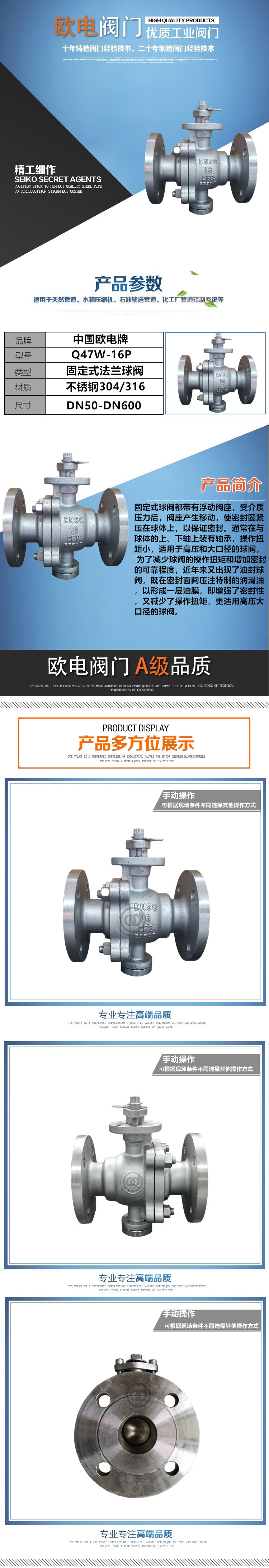 固定式球阀都带有浮动阀座,受介质压力后,阀座产生移动,使密封圈紧压在球体上,以保证密封。通常在与球体的上、下轴上装有轴承,操作扭距小,适用于高压和大口径的阀门。 为了减少球阀的操作扭矩和增加密封的可靠程度,近年来又出现了油封球阀,既在密封面间压注特制的润滑油,以形成一层油膜,即增强了密封性,又减少了操作扭矩,更适用高压大口径的球阀。