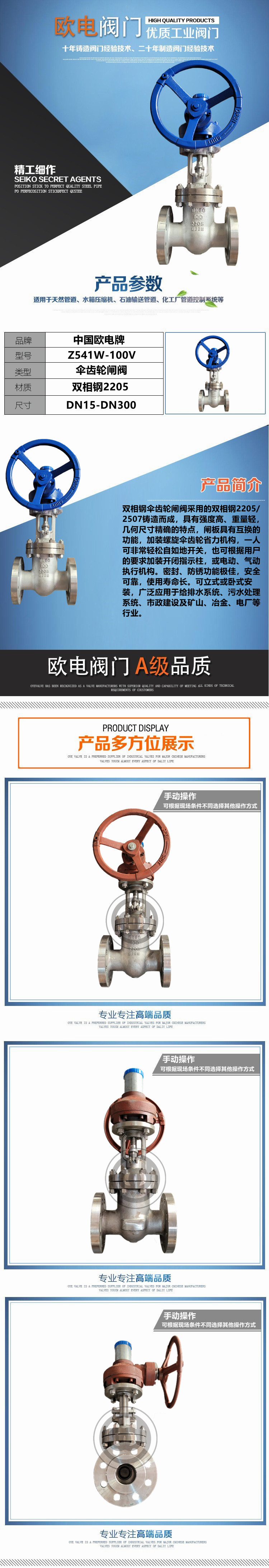 伞齿轮闸阀采用的双相钢2205或者2507铸造而成,具有强度高、重量轻,几何尺寸的特点,闸板具有互换的功能,加装螺旋伞齿轮省力机构,一人可非常轻松自如地开关,也可根据用尸的要求加装开闭指示柱,或电动、气动执行机构。密封、防锈功能,安全可靠,使用寿命长。可立式或卧式安装,广泛应用于给排水系统、污水处理系统、市政建设及矿山、冶金、电厂等行业。