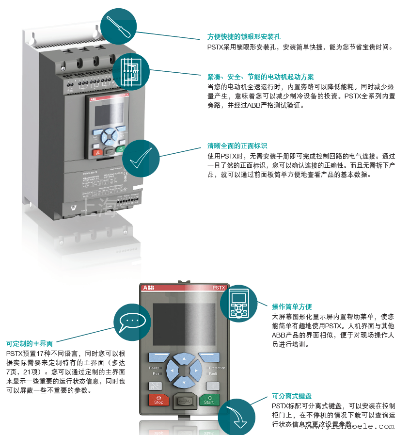 PSTX全智型软起动器,PSTX系列软起动器是ABB结合了行业应用的丰富经验及对特殊应用需求的深刻了解,在多年产品研发的基础上,推出的全新全智型电动机控制与保护产品。它增加了许多新的功能,并提高了应用可靠性。