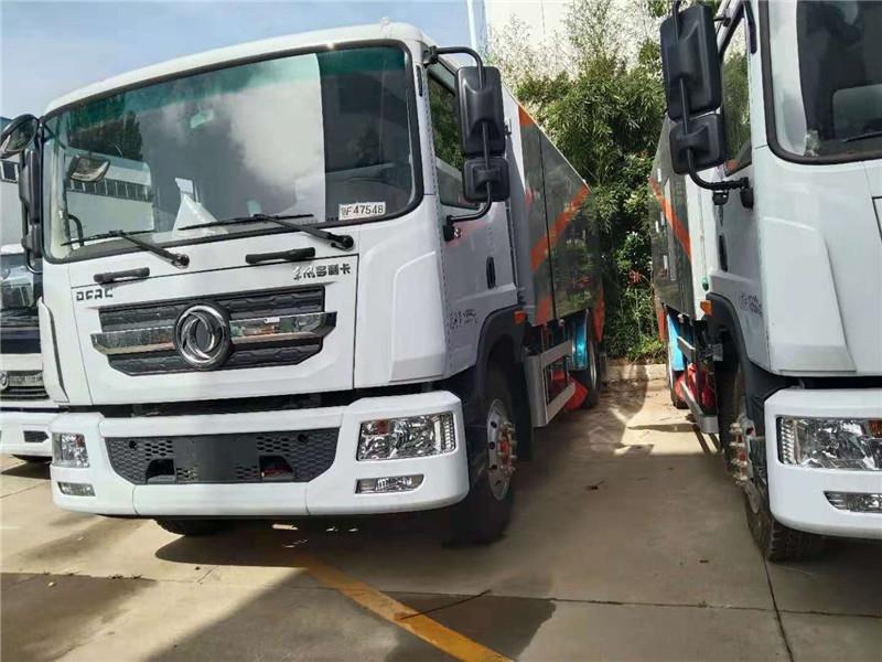 东风天龙后双桥18吨洗扫车采用国六东风天龙底盘,底盘型号DFH1250D4,康明斯290马力发动机,6.7L排量,水箱容积13方,垃圾箱容积9方,