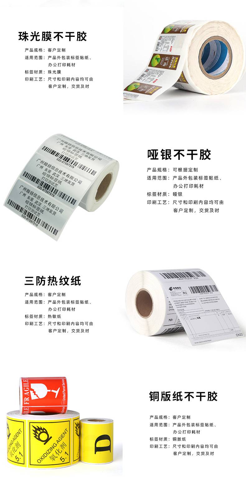 1、标签:标签印刷服务、强粘系列标签、产品标识铭牌、低温高温标签、户外耐候标签、轮胎标签、喷墨标签纸、激光标签纸、铜版纸、热敏纸、合成PP、PET标签、PVC等、卡纸、RFID复合标签、材料定制服务