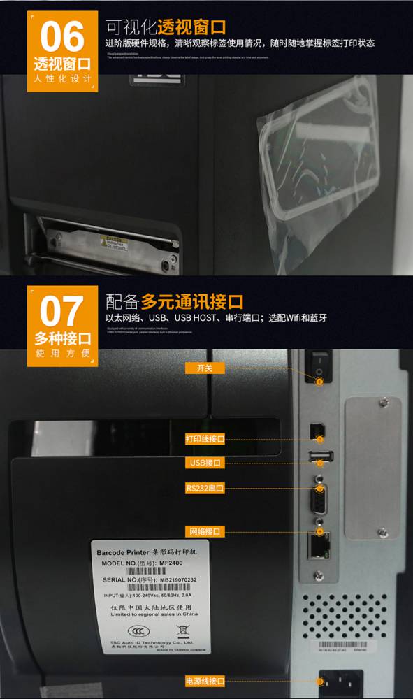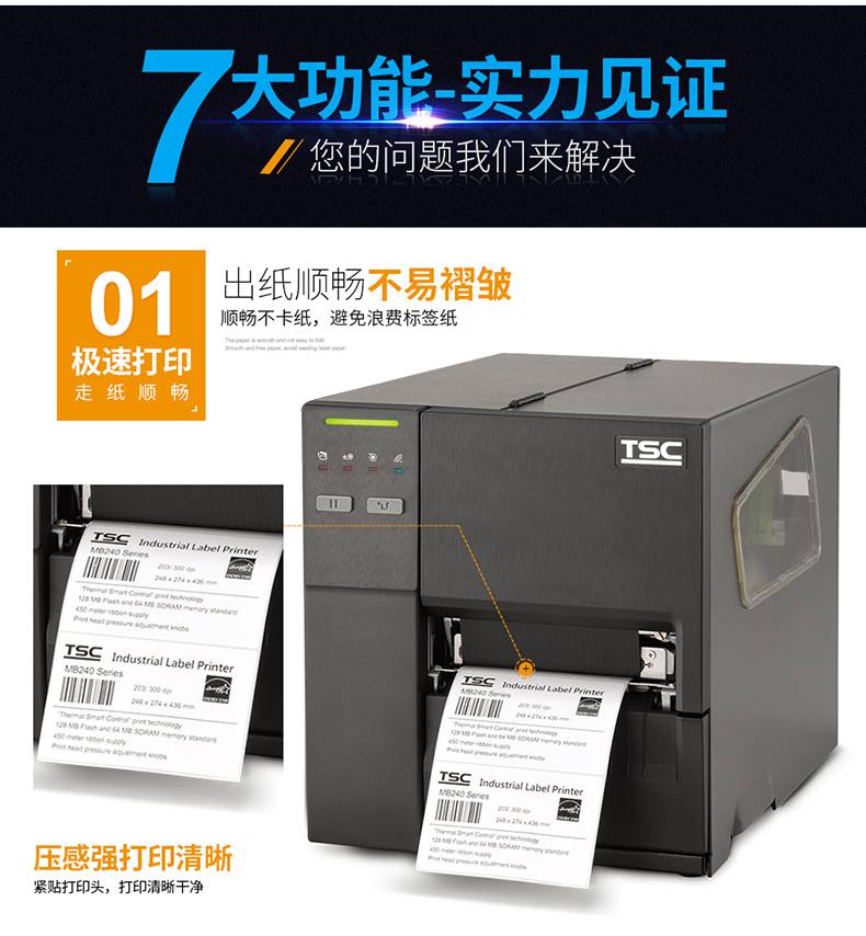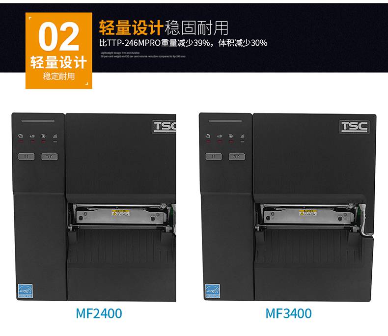 MF3400T系列延续TSC工业型卷标打印机MH240和MX240P的精简结构设计,在4吋宽的轻量工业型机种中为新颖的代表作。MF3400T体积小,简易明了的操作界面及完整选配均适用于每个打印应用需求。