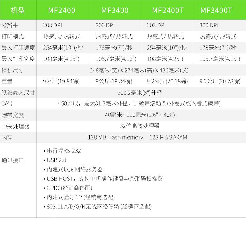 MF3400T有许多通讯接口,包含以太网络、USB、USB-Host、串行埠(RS232)或802.11 a/b/g/n无线网络选配、以太网络或蓝牙。另外,也包含选配GPIO接口模块能够连接各种工业和标签应用设备。
