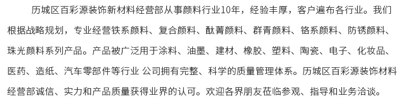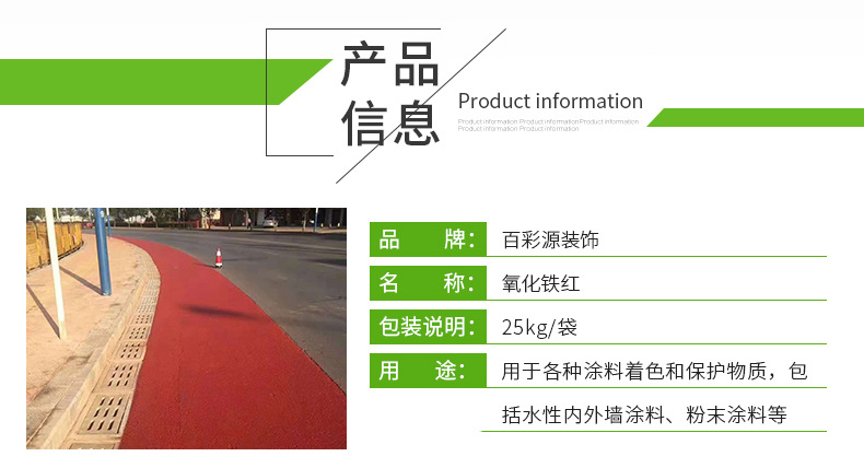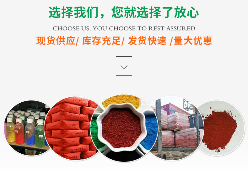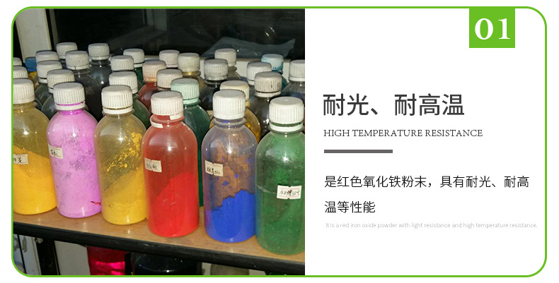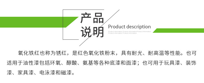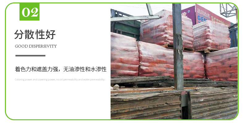氧化铁红用于;油漆、橡胶、塑料、建筑等的着色,是无机颜料,在涂料工业中用作防锈颜料。用作橡胶、人造大理石、地面水磨石的着色剂,塑料、石棉、人造革、皮革揩光浆等的着色剂和,精密仪器、光学玻璃的抛光剂及制造磁性材料铁氧体元件的原料等。用于电子工业、通讯整机、电视机、计算机等磁性原料及行输出变压器、开关电源及其高U及高UQ等的铁氧体磁芯用作分析试剂、催化剂和抛光剂,也用于颜料的配料;用于各类药片、药丸的外衣糖衣着色用用作磁性材料、颜料及制取还原剂、抛光剂、催化剂等;用于药片糖衣和等的着色用作防锈漆的颜料。因该品制成的云母氧化铁防锈漆抗水渗性好,防锈性能优异,可以取代红丹食用红色素。日本用于赤豆饭、魔芋粉食品。对曾用防腐剂处理果柄切口的香蕉加以识别时用。美国多用于猫食、狗食和包装材料无机红色颜料主要用于硬币的透明着色,也用于油漆、油墨和塑料的着色广泛用于油漆、橡胶、塑料化妆品、建筑精磨材料、精密五金仪器、光学玻璃、搪瓷、文教用品、皮革、磁性合金和高级合金钢的着色;