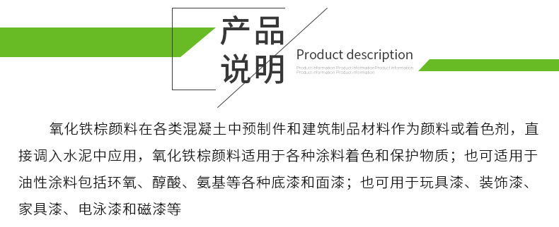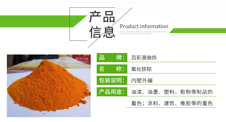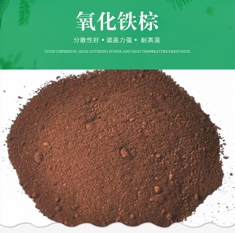 氧化铁棕用途:油漆、油墨、塑料、鞋粉等制品的着色;涂料、建筑、橡胶、塑料等的着色