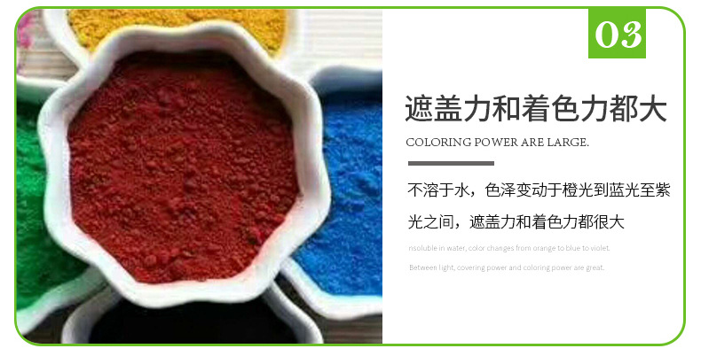 主要用于彩色水泥、彩色水泥地砖、彩色水泥瓦、仿琉璃瓦、混凝土地砖、彩色灰浆 |