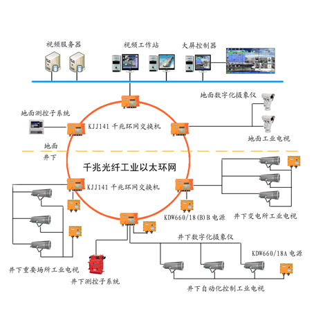 KJJ110型煤矿用隔爆兼本安型传输接口(以下简称通讯接口),属矿用隔爆兼本安型设备,可用于煤矿井下有爆炸性气体混合物,但无破坏绝缘的腐蚀性气体的场合。内置通讯速率高且稳定可靠的光纤收发器,并将光信号还原成RJ45电信号,并通过内部控制器输出4组FSK电信号,为地面和井下设备提供传输通道。由于采用光纤技术,所以避免了由于不同节点地电位不同引起的设备烧毁和强电磁感应、高电压引起的干扰,同时地面至井下采用光纤传输可减少雷电等自然灾害造成的损失。