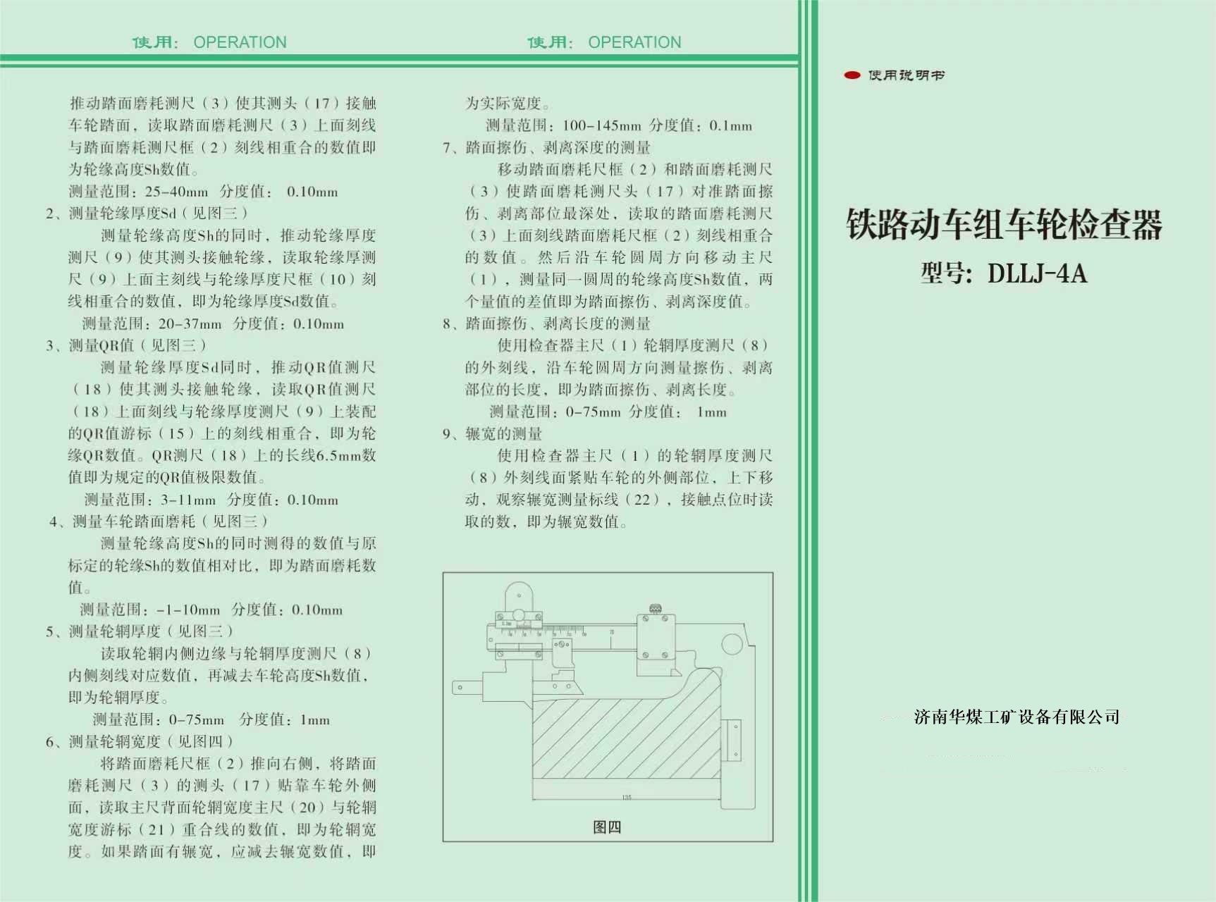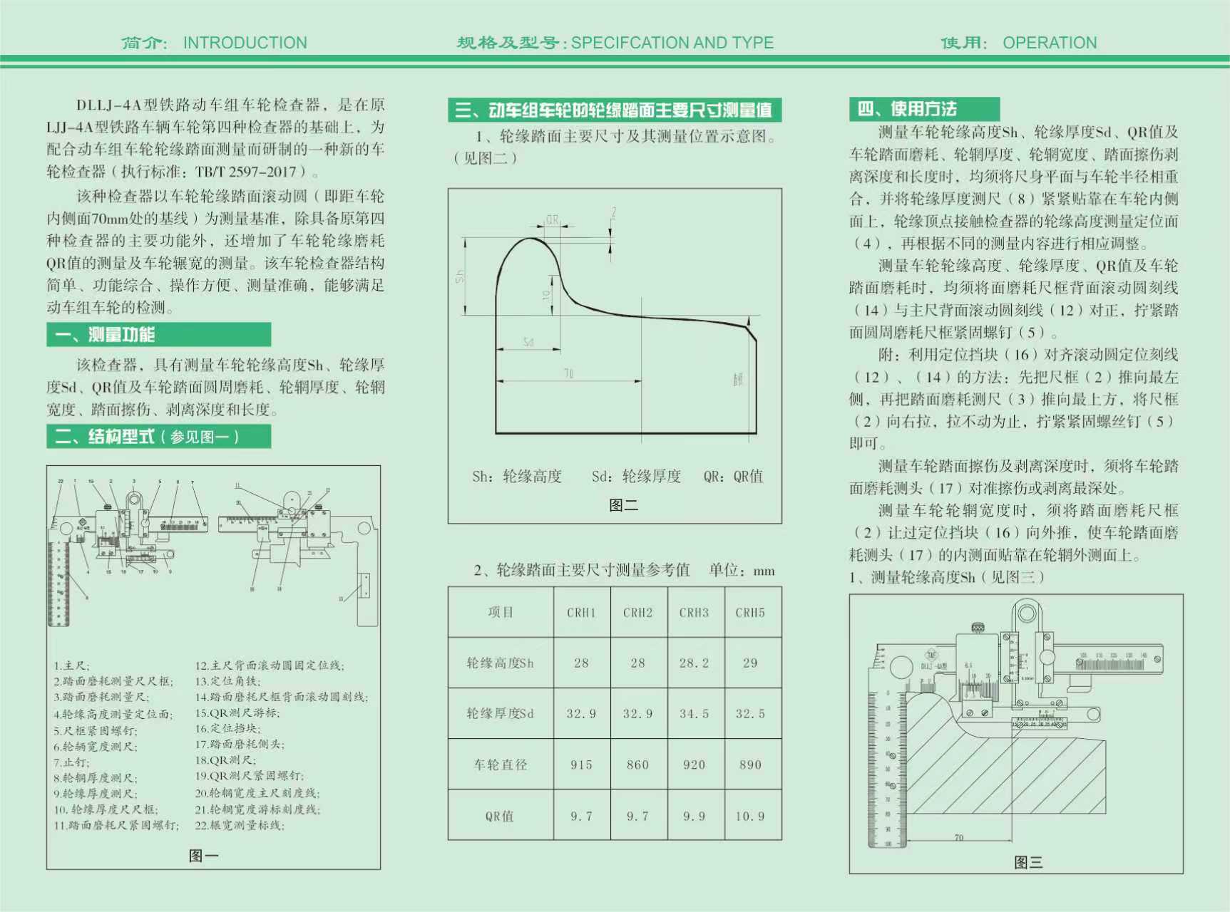 机车车辆车轮第四种检查器(以下简称为“检查器”)用于测量各种型号机车车辆车轮踏面圆周磨耗、轮缘厚度、轮缘高度、轮箍(辋)厚度、轮箍(辋)宽度、轮缘垂直磨耗、QR值、踏面擦伤和长度、踏面剥离和长度、车轮碾宽等。