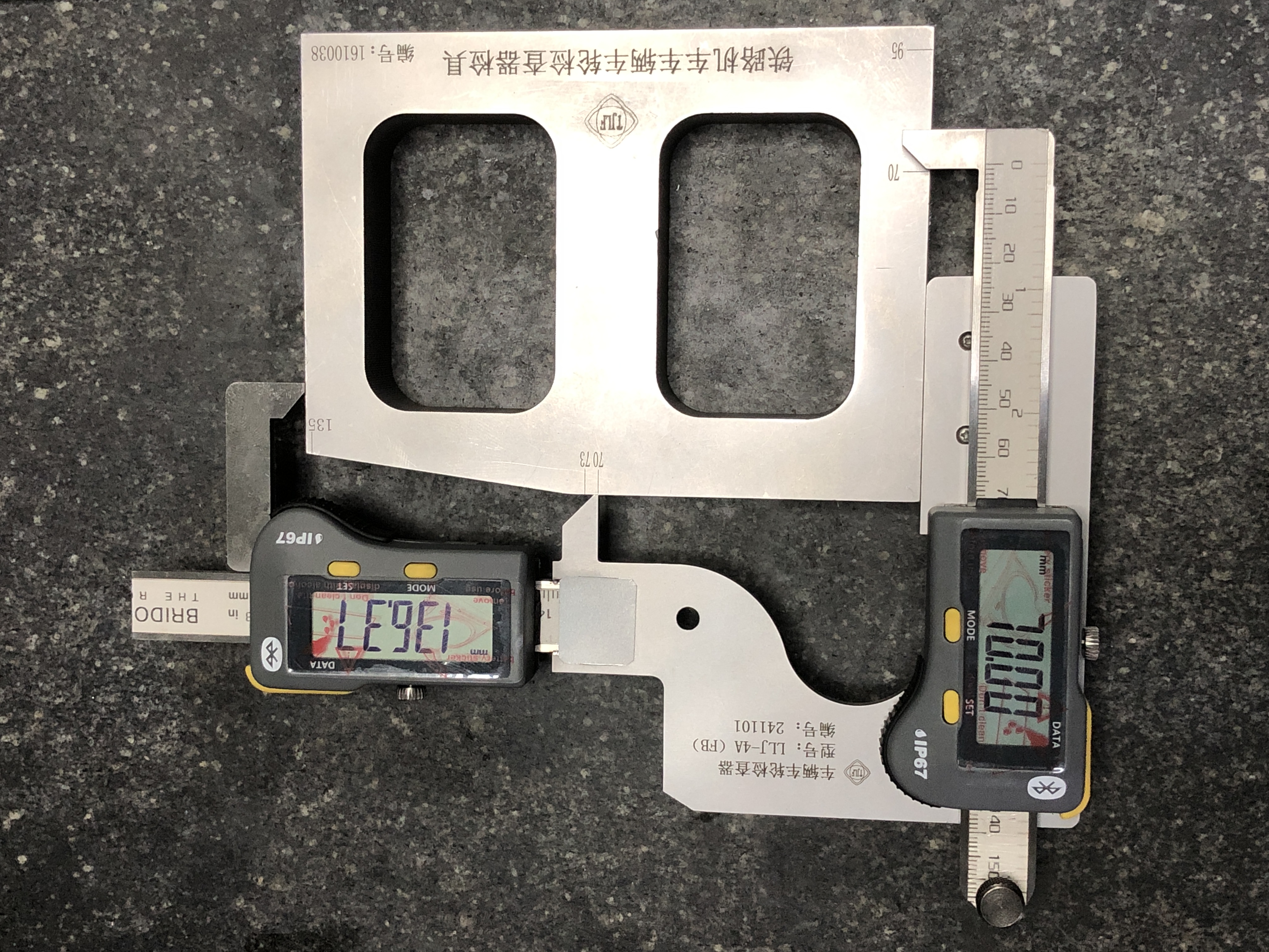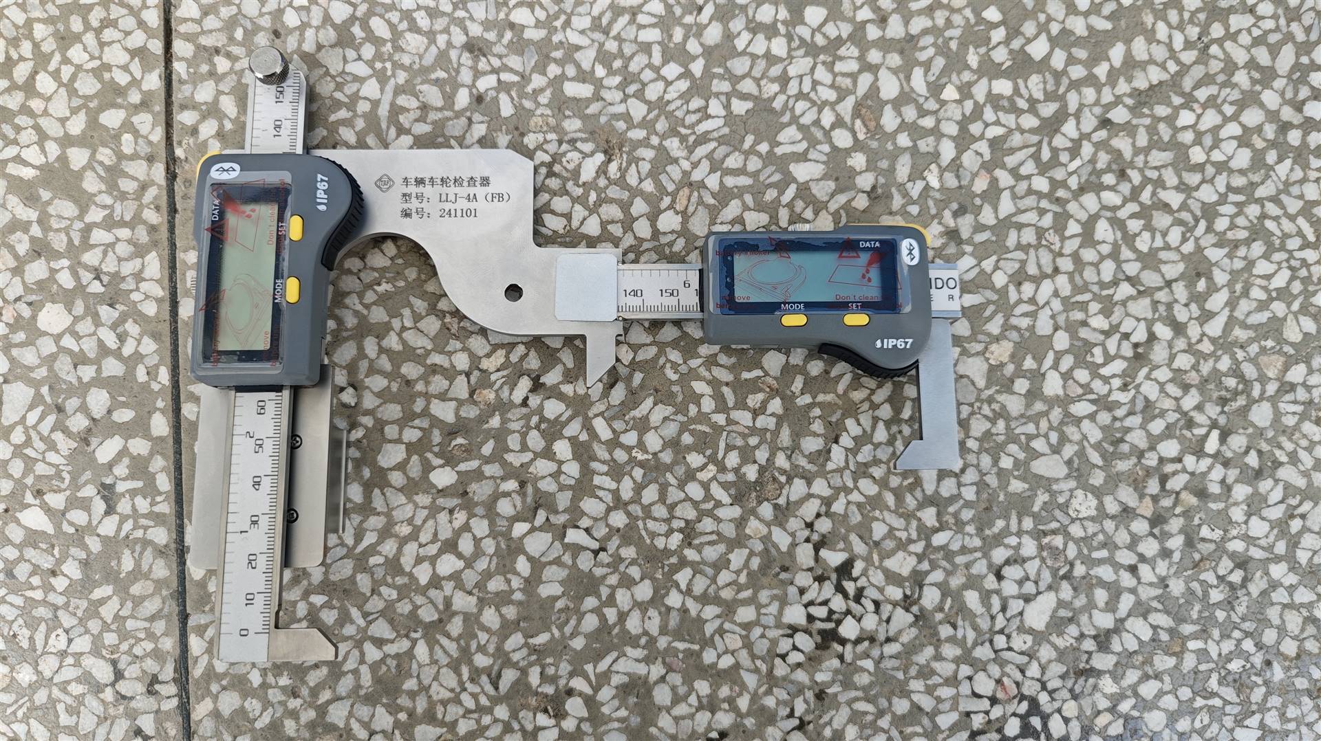 3、推动踏面磨耗测尺使其测量面与车轮轮缘接触,以左边游标读取踏面磨耗值,从右边游标读取轮缘高度值。