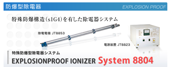 除電電極、電源装置、高圧ケーブル、接続器具で構成する特殊防爆構造(s1G4)を有した除電器システムです。充実した安全装置に加え、電極部の絶縁材料には難燃性V0相当を使用するなど、安全性重視の設計となっています。